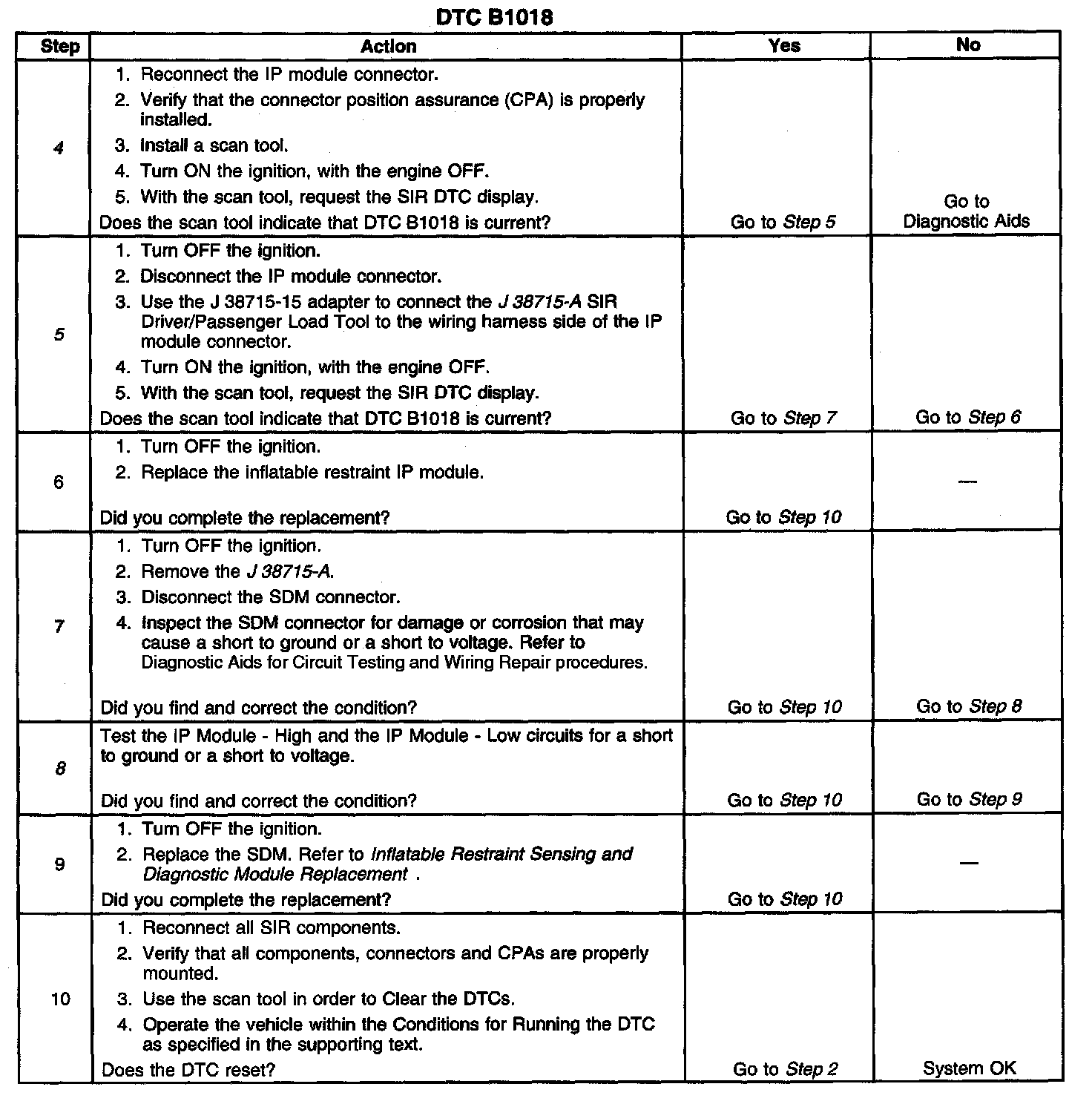 CIRCUIT DESCRIPTIONThe inflatable restraint IP module deployment loop consists of an inflatable restraint IP module, the IP module high and IP module low circuits. A shorting bar is used in the inflatable restraint IP module connector which will short together the IP module - high and IP module low circuits when the connector is disconnected, this will help to prevent unwanted deployment of the inflator module during servicing. When the ignition is turned ON, the inflatable restraint sensing and diagnostic module (SDM) performs continuous diagnostic tests on the deployment loops to check for proper circuit continuity and for shorts to ground or voltage. If a malfunction is detected, a DTC will be stored.