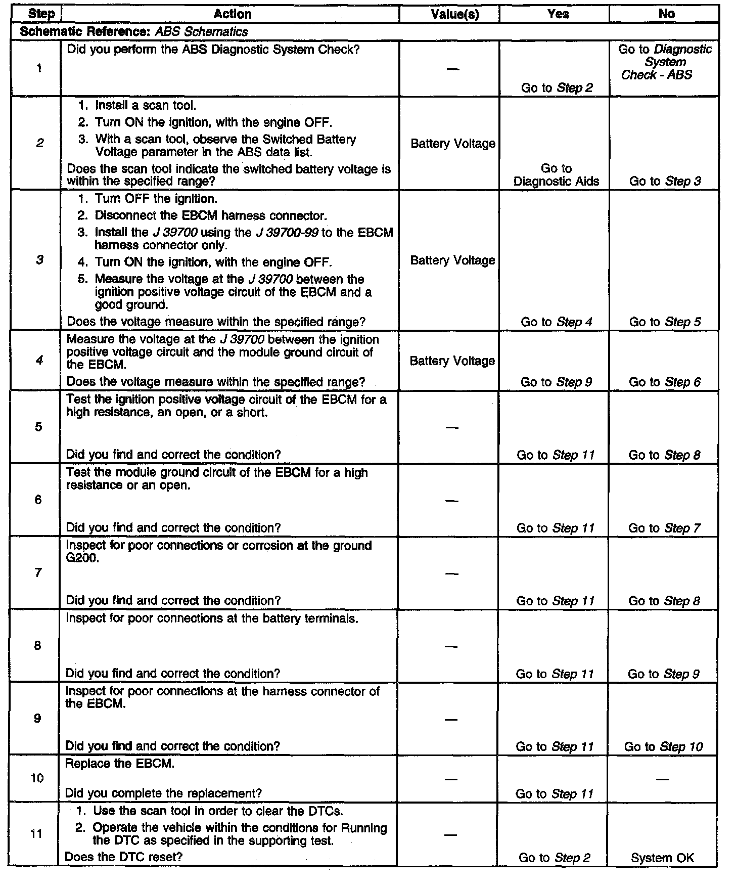 This DTC is used to monitor the voltage level available to the EBCM. If the voltage drops below specific levels at specific times, full performance of the ABS system cannot be guaranteed. During an ABS event, there are several current requirements that will cause battery voltage to drop. Because of this, voltage is monitored prior to an ABS event and also during an ABS event operation when voltage may drop significantly.