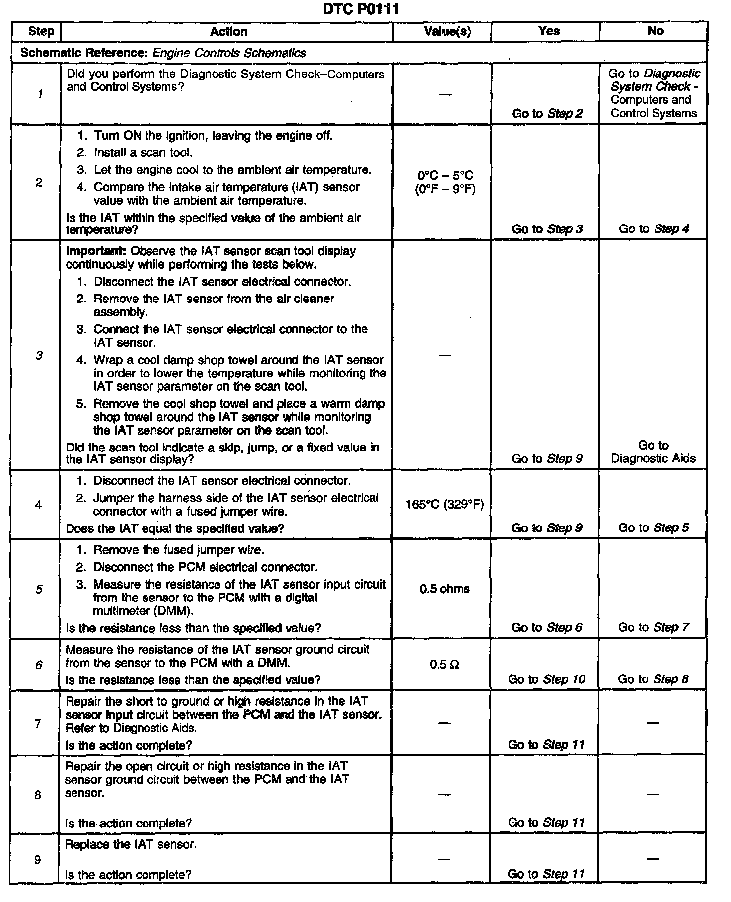 Check for a faulty electrical connection to the PCM. Use the Temperature Vs Resistance table in order to check the IAT sensor at various temperature levels and evaluate the possibility of a shifted (incorrectly calibrated) sensor. A shifted sensor could result in a DTC P0111. Refer to Temperature Vs Resistance.