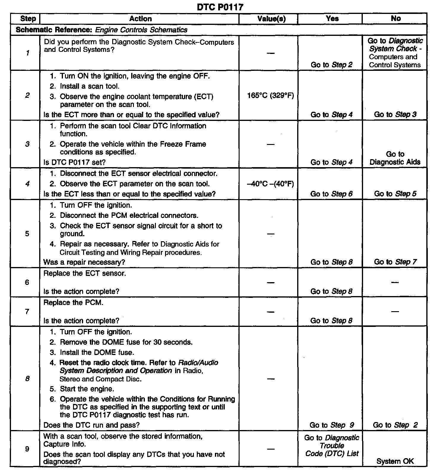 8. Clearing the DTCs by removing the DOME fuse also clears the PCM long term memory. Using the scan tool to clear DTCs leaves the long term memory active. DTC emitting diagnostics may not run to completion as expected unless the long term memory is cleared. Removal of the DOME fuse also clears the time display of the radio. The DTC P0117 diagnostic can be monitored on the scan tool under the Not Ran Since Code Cleared selection in the DTC Information menu. If a DTC P0117 appears in the Not Ran Since Code Cleared list, the DTC P0117 diagnostic has not yet run. When the DTC P0117 does not appear in the Not Ran Since Code Cleared list, the DTC P0117 diagnostic has run. If the MIL is NOT illuminated, and there is no Pending DTC Status in DTC Information, the DTC P0117 diagnostic has passed. The DTCs MUST be cleared in order to view the Current Status of the Not Ran Since Code Cleared list. DO NOT forget that the Not Ran Since Code Cleared list only indicates that the test has run, not whether the test passed or failed. The DTC Information screen must be checked for Current or Pending status, in order to determine the outcome of the diagnostic test involved.