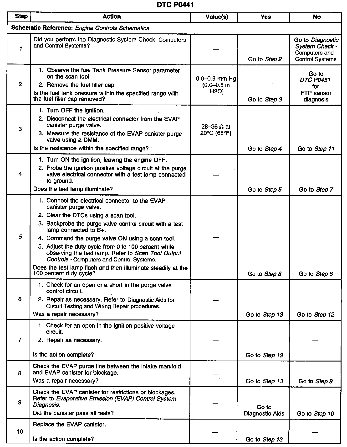 CIRCUIT DESCRIPTIONThe DTC P0441 evaporative emission (EVAP) System No Flow During Purge diagnostic monitors the performance of the EVAP canister purge routine. Ignition voltage is supplied directly to the EVAP canister purge valve solenoid. The powertrain control module (PCM) opens the purge valve by grounding the solenoid control circuit using an internal solid state device called a driver. If Idle Air Control (IAC) and engine load values do not correspond with purge activity, a DTC P0441 will set.