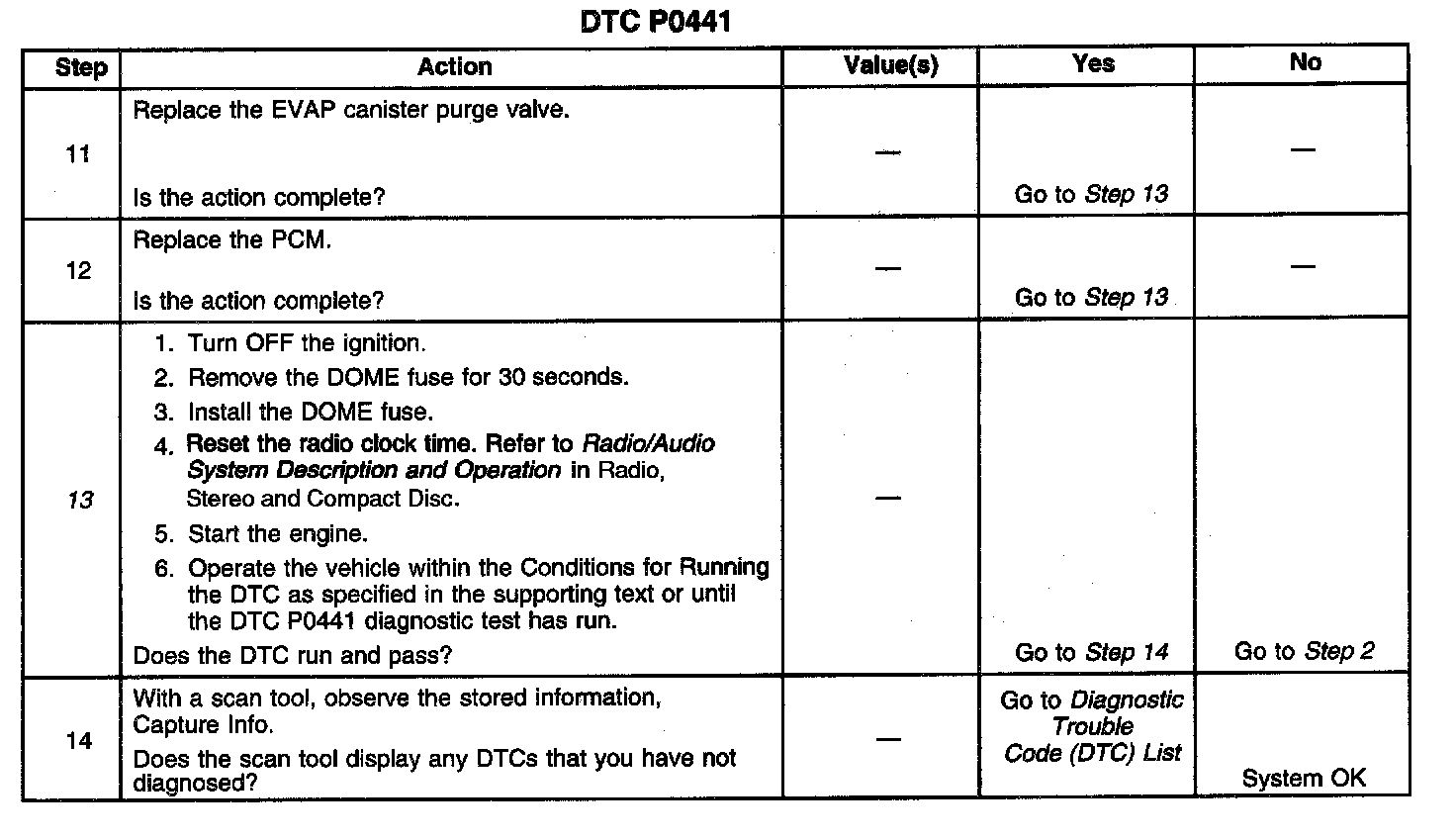 13. Clearing the DTCs by removing the DOME fuse also clears the PCM long term memory. Using the scan tool to clear DTCs leaves the long term memory active. DTC emitting diagnostics may not run to completion as expected unless the long term memory is cleared. Removal of the DOME fuse also clears the time display of the radio. The DTC P0441 diagnostic can be monitored on the scan tool under the Not Ran Since Code Cleared selection in the DTC Information menu. If a DTC P0441 appears in the Not Ran Since Code Cleared list, the DTC P0441 diagnostic has not yet run. When the DTC P0441 does not appear in the Not Ran Since Code Cleared list, the DTC P0441 diagnostic has run. If the MIL is NOT illuminated, and there is no Pending DTC Status in DTC Information, the DTC P0441 diagnostic has passed. The DTCs MUST be cleared in order to view the Current Status of the Not Ran Since Code Cleared list. DO NOT forget that the Not Ran Since Code Cleared list only indicates that the test has run, not whether the test passed or failed. The DTC Information screen must be checked for Current or Pending status, in order to determine the outcome of the diagnostic test involved.