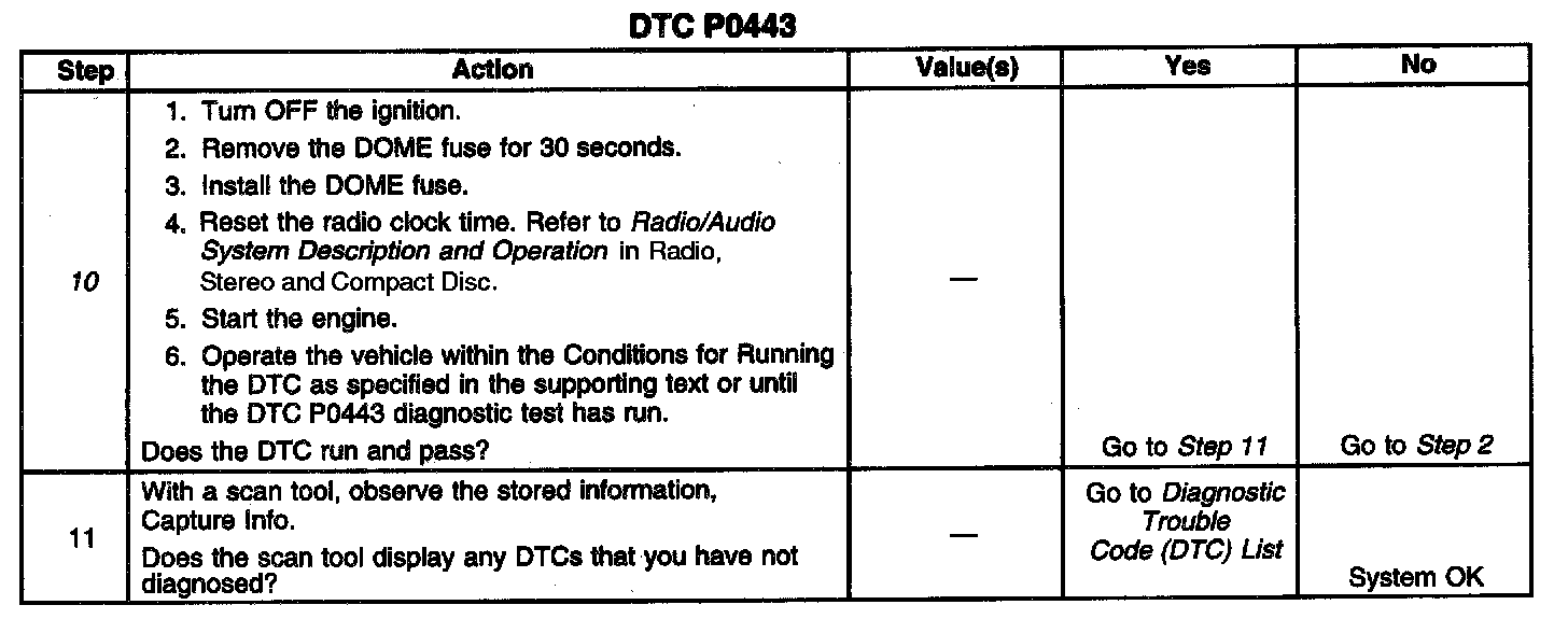 10. Clearing the DTCs by removing the DOME fuse also clears the PCM long term memory. Using the scan tool to clear DTCs leaves the long term memory active. DTC emitting diagnostics may not run to completion as expected unless the long term memory is cleared. Removal of the DOME fuse also clears the time display of the radio. The DTC P0443 diagnostic can be monitored on the scan tool under the Not Ran Since Code Cleared selection in the DTC Information menu. If a DTC P0443 appears in the Not Ran Since Code Cleared list, the DTC P0443 diagnostic has not yet run. When the DTC P0443 does not appear in the Not Ran Since Code Cleared list, the DTC P0443 diagnostic has run. If the MIL is NOT illuminated, and there is no Pending DTC Status in DTC Information, the DTC P0443 diagnostic has passed. The DTCs MUST be cleared in order to view the Current Status of the Not Ran Since Code Cleared list. DO NOT forget that the Not Ran Since Code Cleared list only indicates that the test has run, not whether the test passed or failed. The DTC Information screen must be checked for Current or Pending status, in order to determine the outcome of the diagnostic test involved.