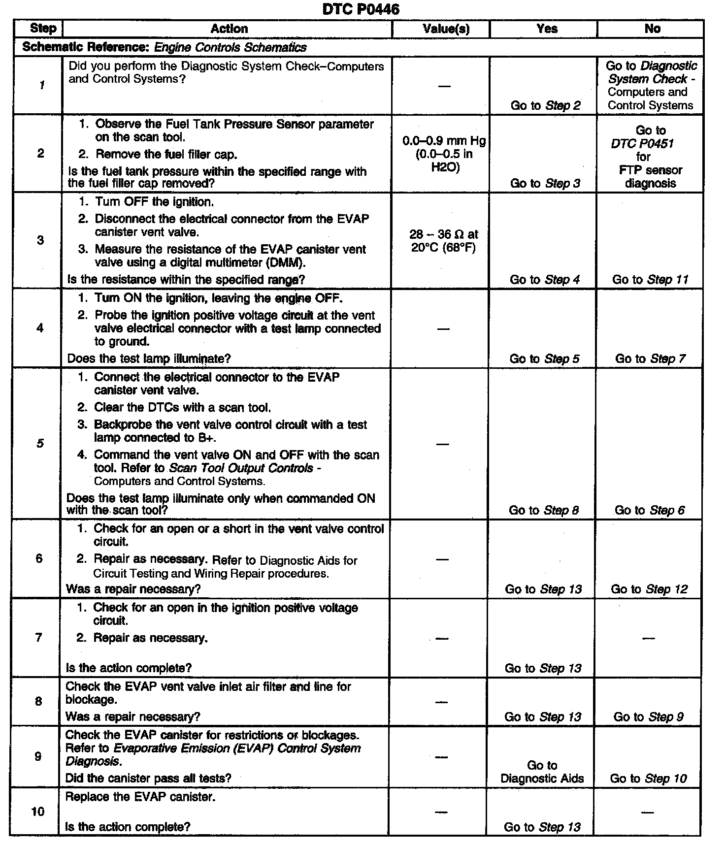 CIRCUIT DESCRIPTIONThe DTC P0446 Evaporative Emissions (EVAP) Vent System Performance diagnostic monitors the performance of the EVAP system vent routine. Ignition voltage is supplied directly to the EVAP canister vent valve solenoid. The powertrain control module (PCM) closes the vent valve by grounding the solenoid control circuit using an internal solid state device called a driver. When the valve is closed, the FTP sensor will indicate a drop in pressure in the EVAP system during purge activity. If Fuel Tank Pressure (FTP) sensor values do not correspond with vent valve activity, a DTC P0446 will set.