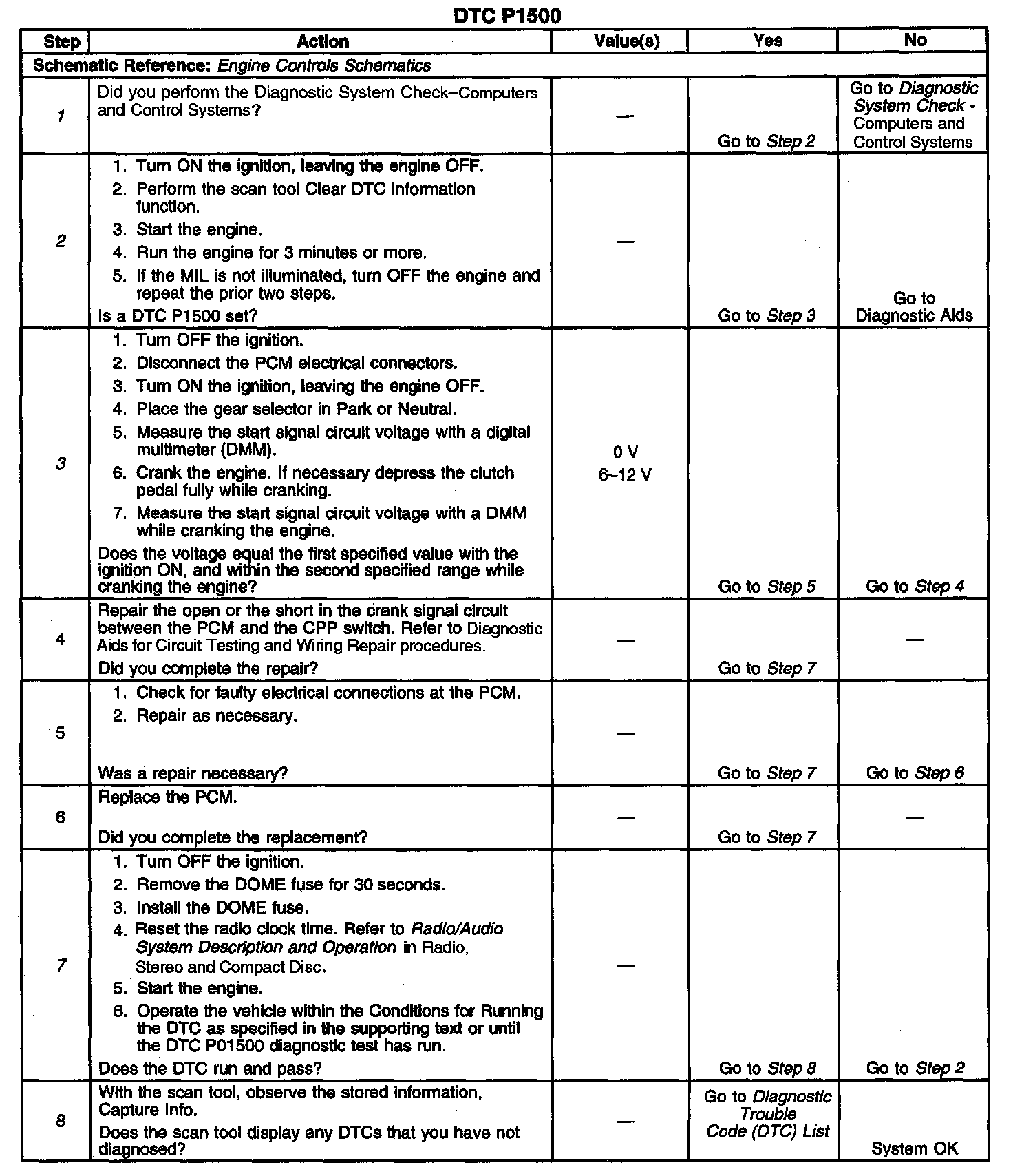 3. This step checks for the correct voltage on the crank signal circuit. While the engine is cranking, the PCM crank signal terminal should have a voltage reading of 6 to 12 volts and after the engine is started, the PCM crank signal terminal should have a voltage reading of 0 volts.