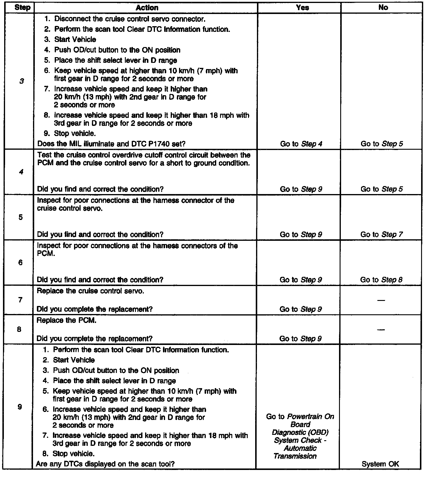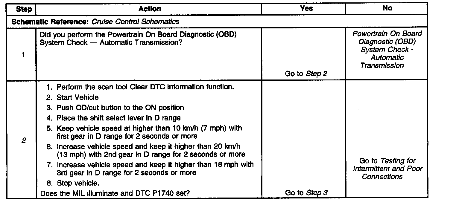 Circuit DescriptionThe DTC P1740 Cruise Control Overdrive (OD) Cut Control signal circuit shorted to ground diagnostic monitors the Overdrive (OD) Cut Control signal between the cruise control module and the PCM. During normal operation of the cruise control system, if the cruise control system detects long grades or hilly conditions, it will send a ground signal to the PCM which will disengage overdrive. If the cruise control cutoff signal circuit experiences a short to ground condition when the vehicle is traveling less than 10 km/h (7 mph), the PCM will disengage overdrive and generate the DTC P1740 and illuminate the MIL.