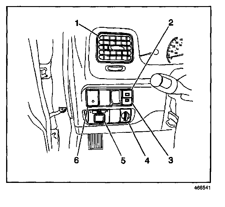 2. Release the upper and lower retaining tabs behind the instrument panel which secure the outside remote control rearview mirror switch (5).