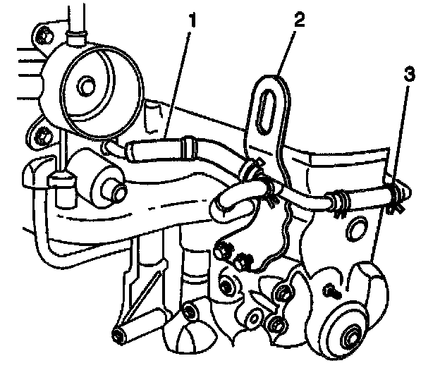 13. Install the bypass hose (3) to the coolant outlet pipe.