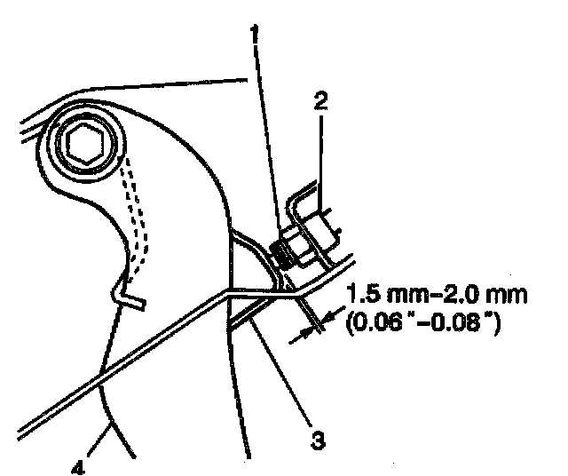 - The clearance between the end of the thread and the brake pedal stopper (3) should be 1.5 - 2.0 mm (0.06 - 0.08 inch).
