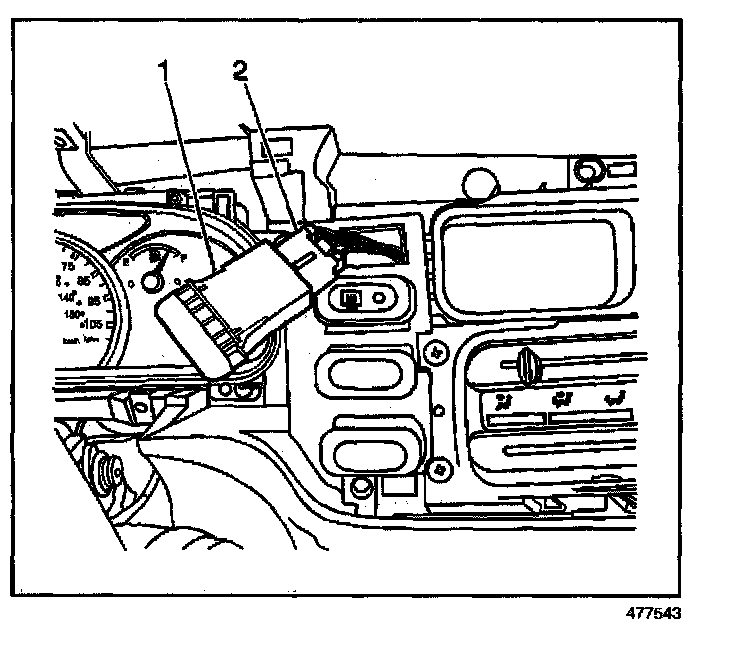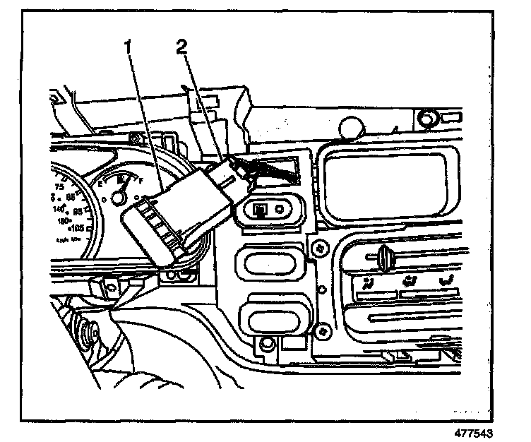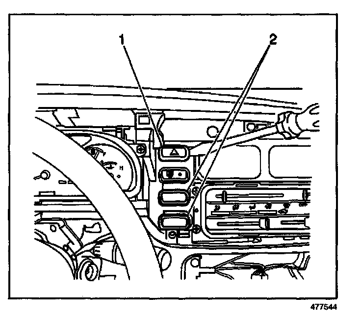 2. Using a taped flat bladed tool, gently pry the hazard warning switch (1) from the instrument panel.
