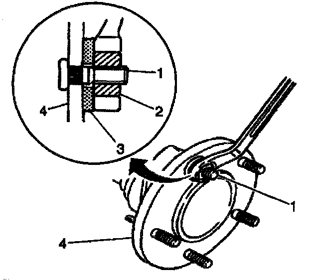1. Align the serrations on the wheel stud (1) with the serrations in the rear axle flange hole.