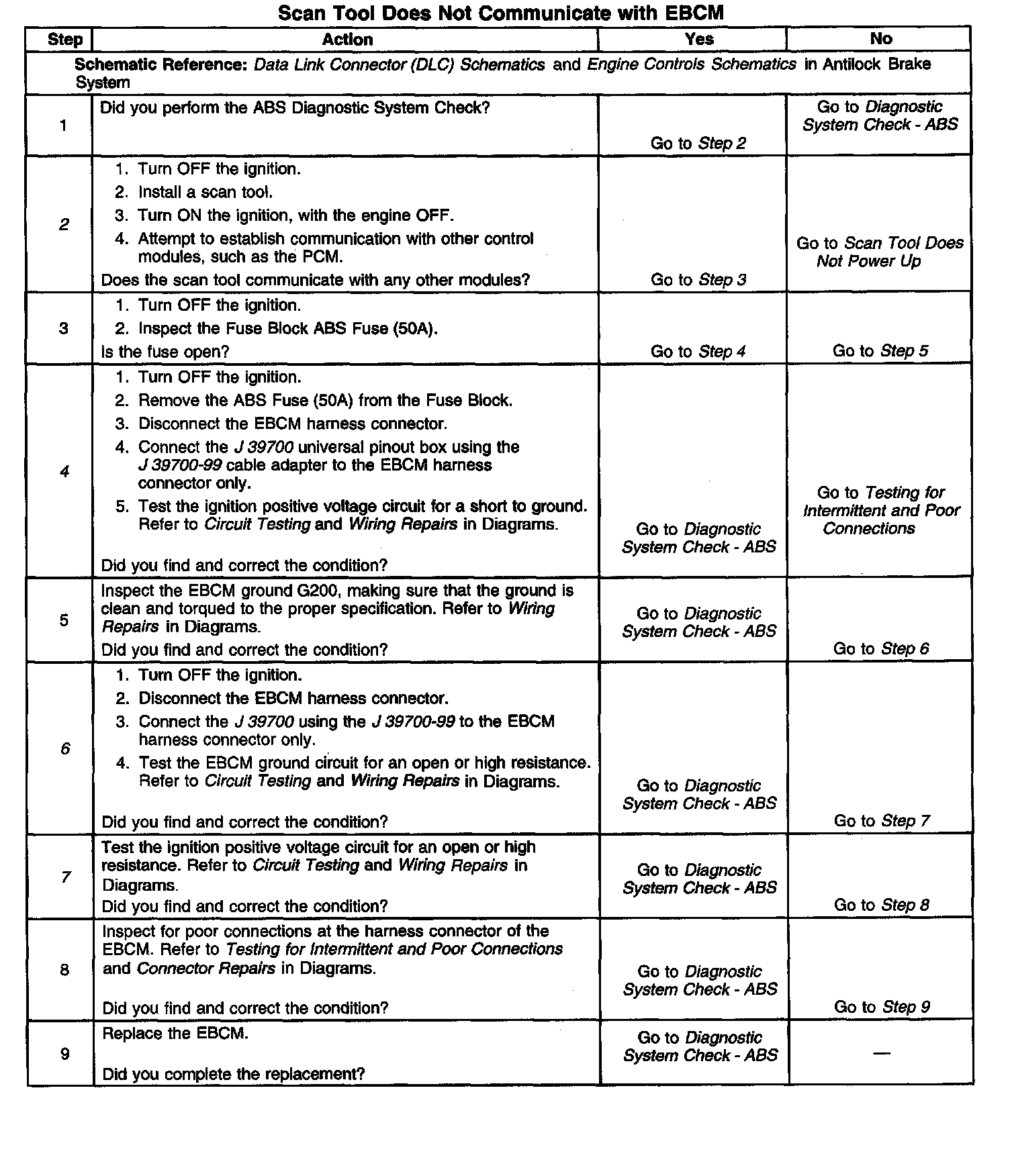 If communication with the EBCM is not possible with a scan tool, ensure these circuits are in good condition and that there is no excessive resistance. Also check the EBCM connectors for poor connector terminal contact.