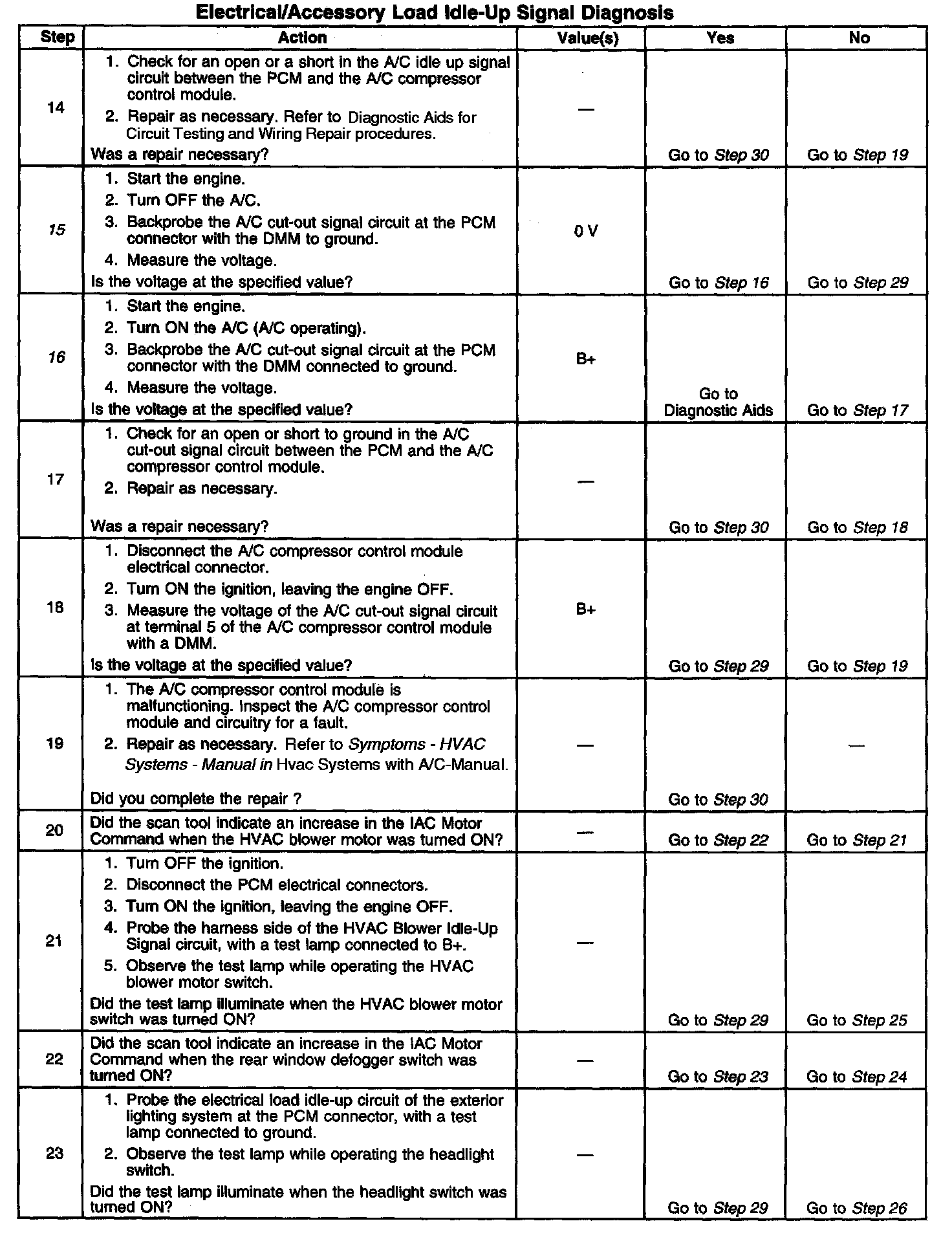 3. This step checks whether the PCM is responding to idle-up input signals from the A/C compressor control module. The PCM commands the IAC valve to increase the IAC Motor Command percentage when receiving the idle-up signal. The IAC Motor Command parameter on the scan tool should increase 4-11 percent when operating the A/C. If the scan tool does not indicate an increase in the IAC Motor Command when the A/C is turned ON, the PCM may not be receiving the idle-up signal.