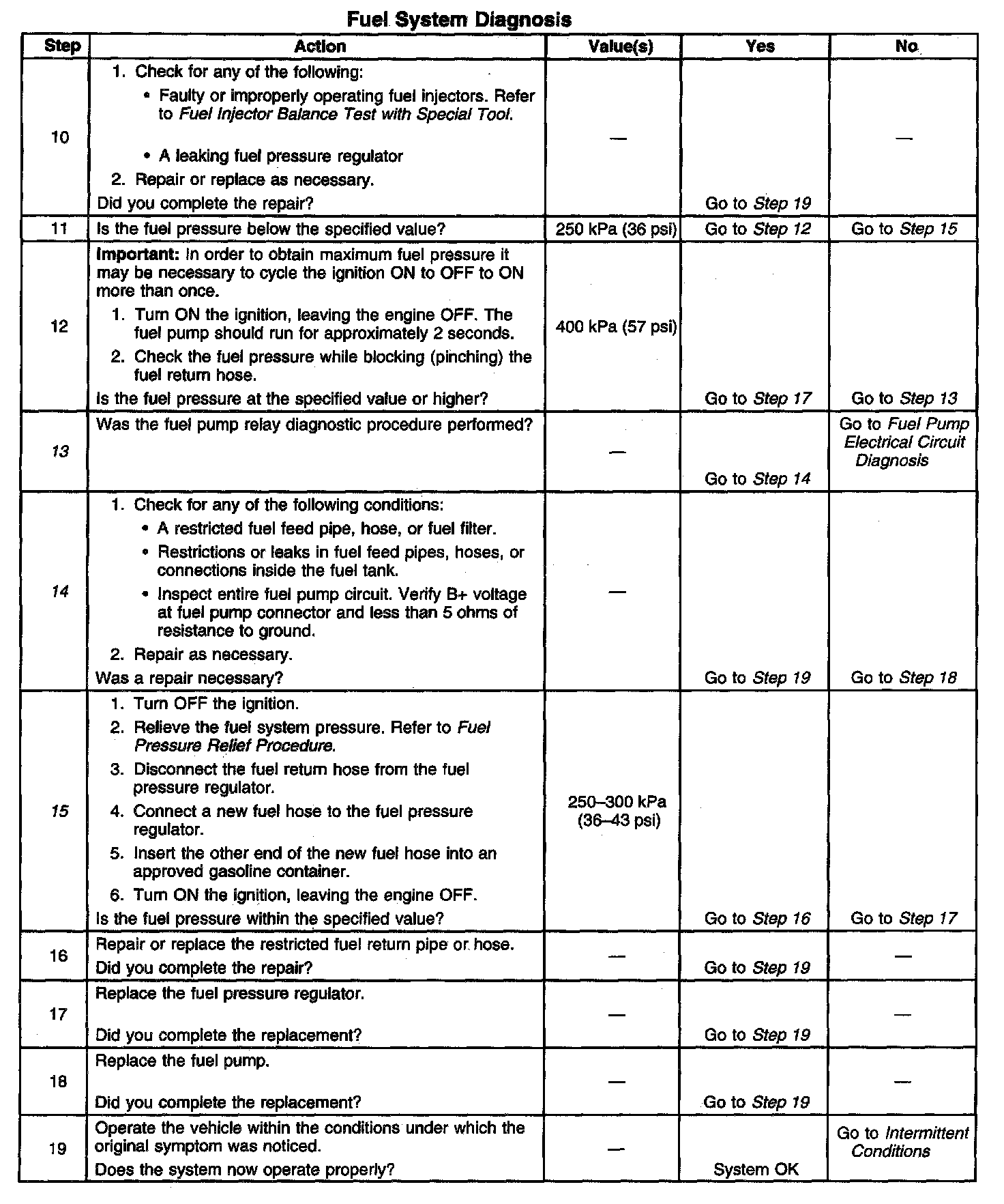14. This step checks for additional conditions that can cause low fuel pressure other than a faulty fuel pump. Check for any restrictions or blockage in the fuel feed lines and hoses, including those inside the fuel tank. Check the fuel pump electrical circuit for excessive resistance. Proper fuel pump operation requires correct voltage and adequate current flow.