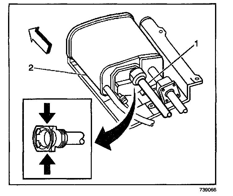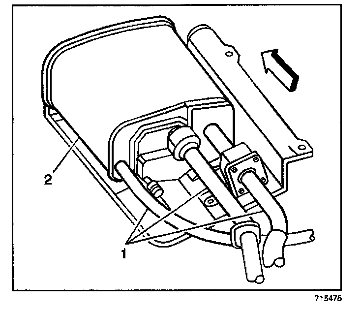 3. Disconnect the two hoses (1) from the EVAP canister (2).