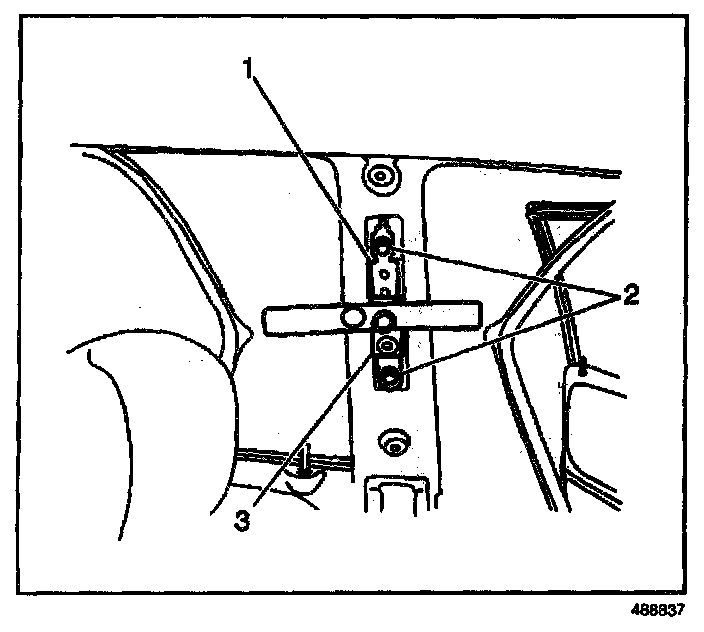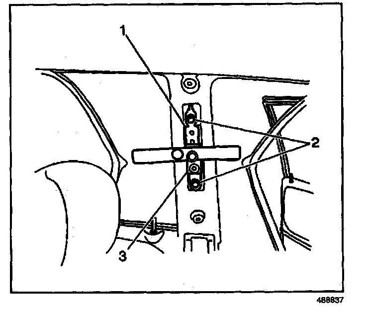 1. Install the front seat belt shoulder belt retractor tension adjuster (1) to the vehicle. Secure the adjuster with the 2 bolts (2).