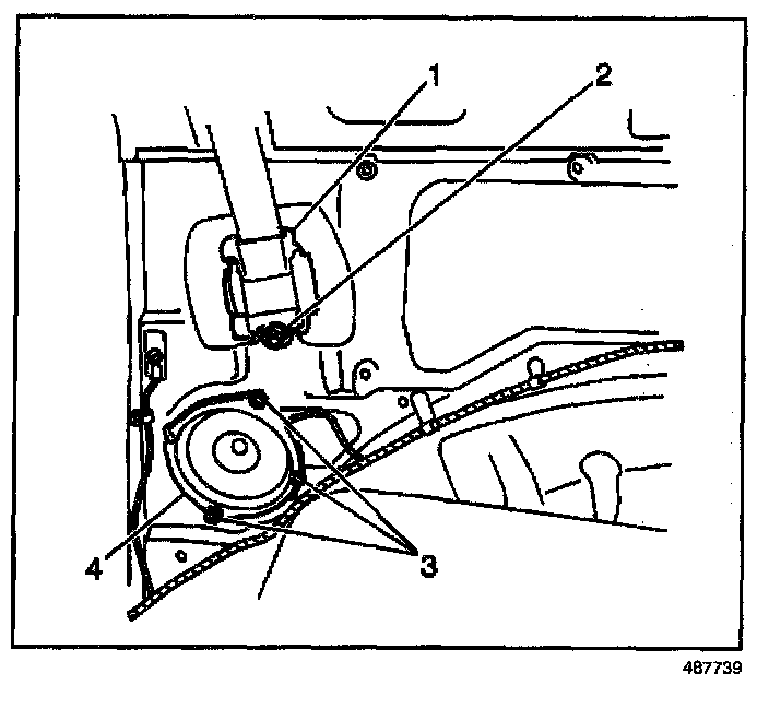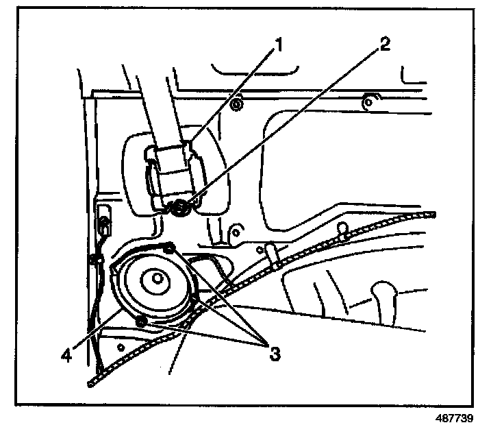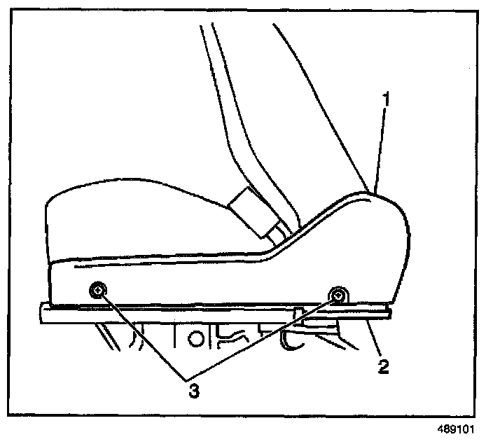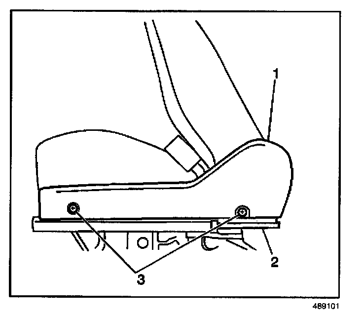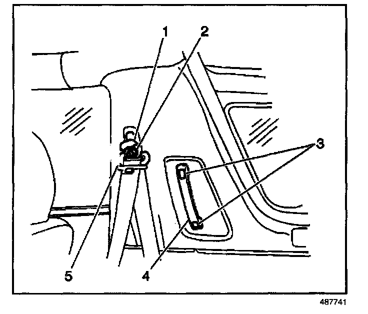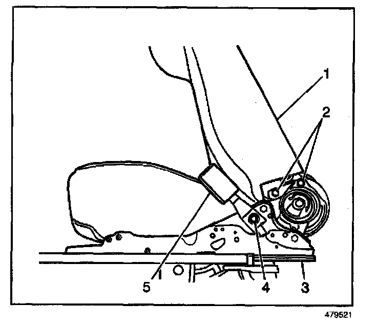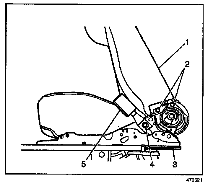 1. Install the front seat belt buckle (5) to the front seat inner adjuster (3). Secure the buckle with the anchor bolt (4).