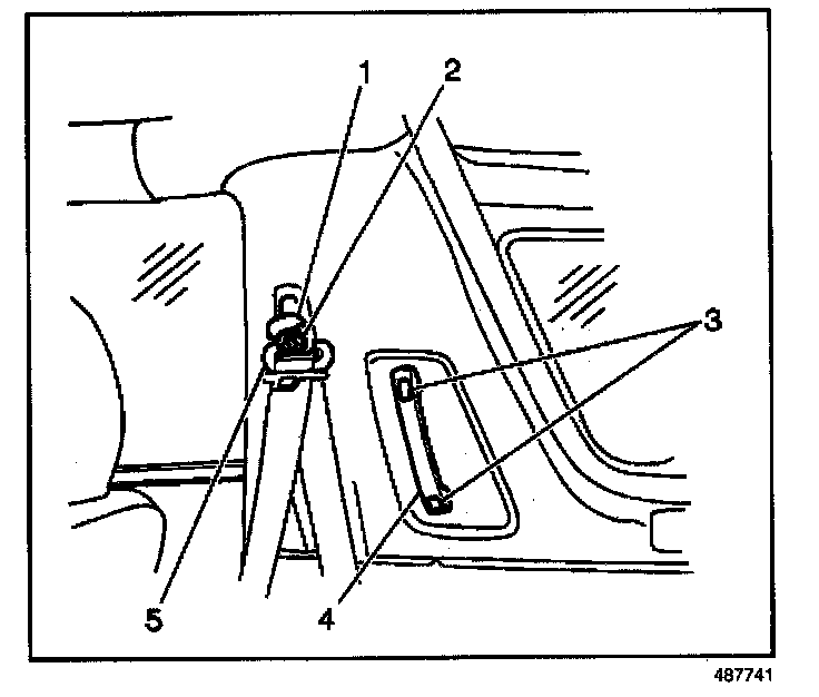 3. Remove the shoulder guide anchor bolt (2) which secures the front seat belt (5) to the center pillar.