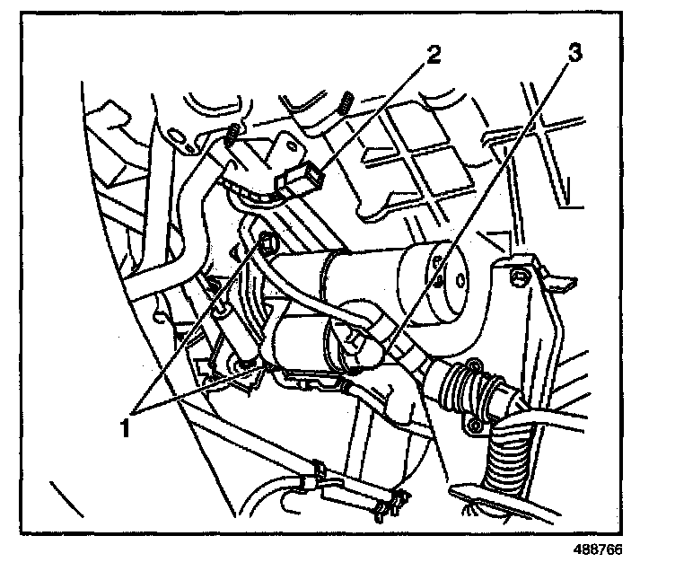 2. Install the starter upper mounting bolt (1) and the ground wire.