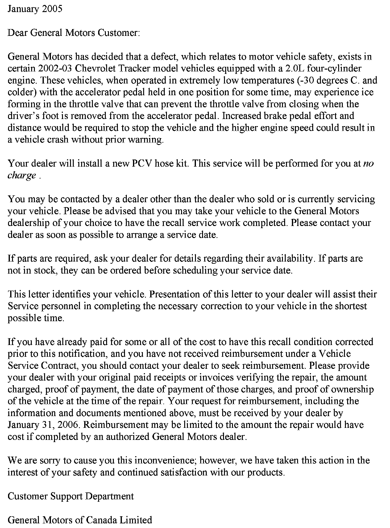 Recall - Throttle Valve Freezing