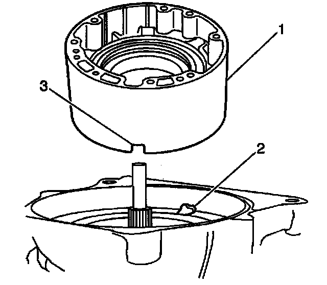 3. Install the overdrive case to the transmission case, aligning the cutouts on each case (2)(3).