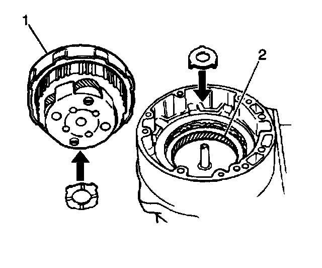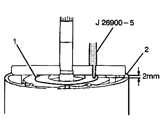 9. Measure the height difference between the overdrive case (2) and the overdrive clutch drum (1) using the J 26900-5.