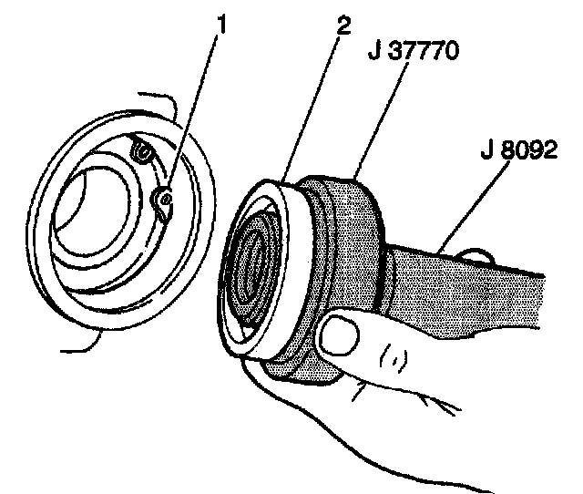 1. Install the new right drive axle shaft oil seal (1) into the front axle housing (2) using the J 37770 with the J 8092.