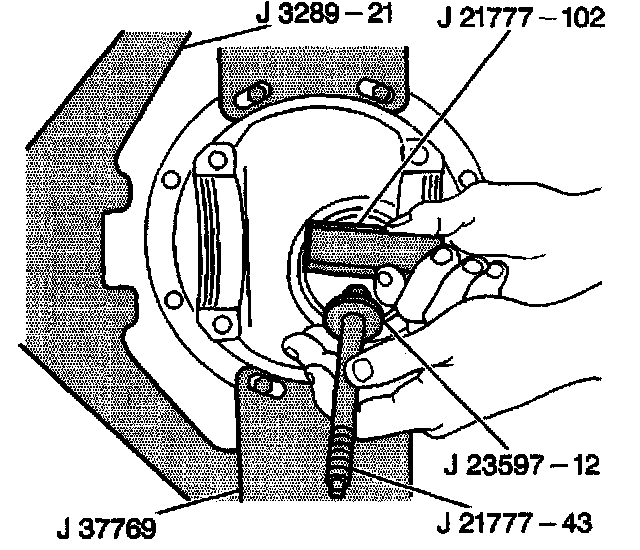 21. Remove the J 21777-102 and with the J 23597-12, the J 21777-43 and the J 21777-42 from the differential carrier.