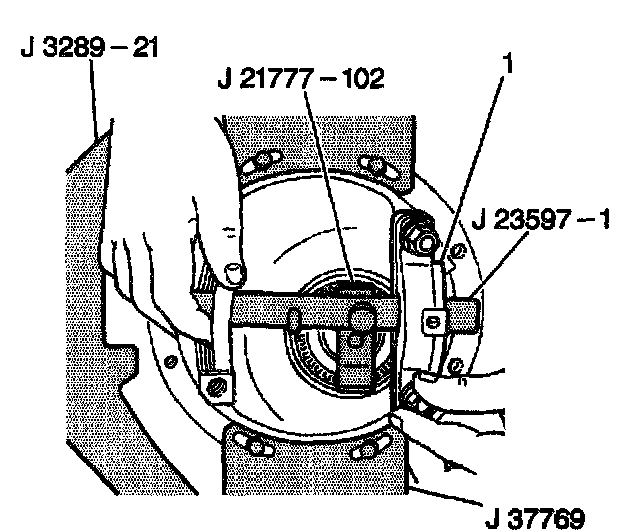 7. Install the J 21777-101 in the side bearing bores with J 23597-1 through both side bearing discs.