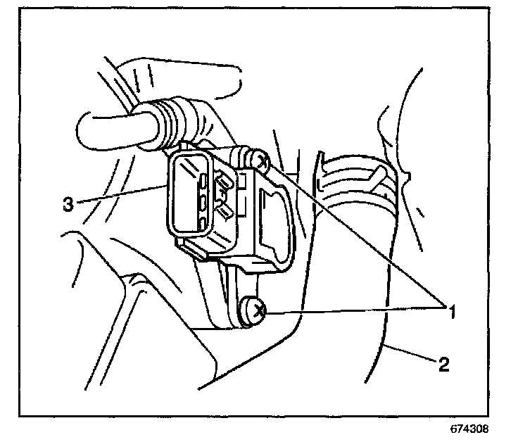 4. Install the two fasteners (1) securing the TP sensor (3) to the throttle body.
