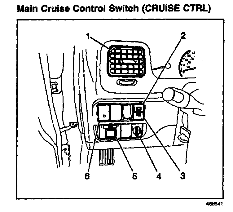 The main cruise control switch - CRUISE CTRL (6) has 2 momentary contact buttons. The main cruise control switch is on the instrument panel, to the left of the steering column. The switch turns the cruise control system ON or OFF.