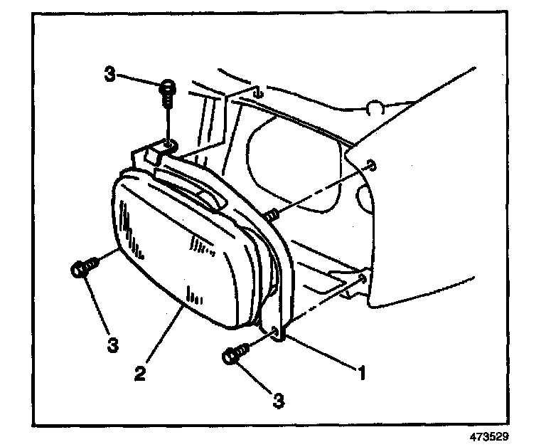 1. Install the headlamp assembly (1,2) to the vehicle. Secure the assembly with the 3 bolts (3).