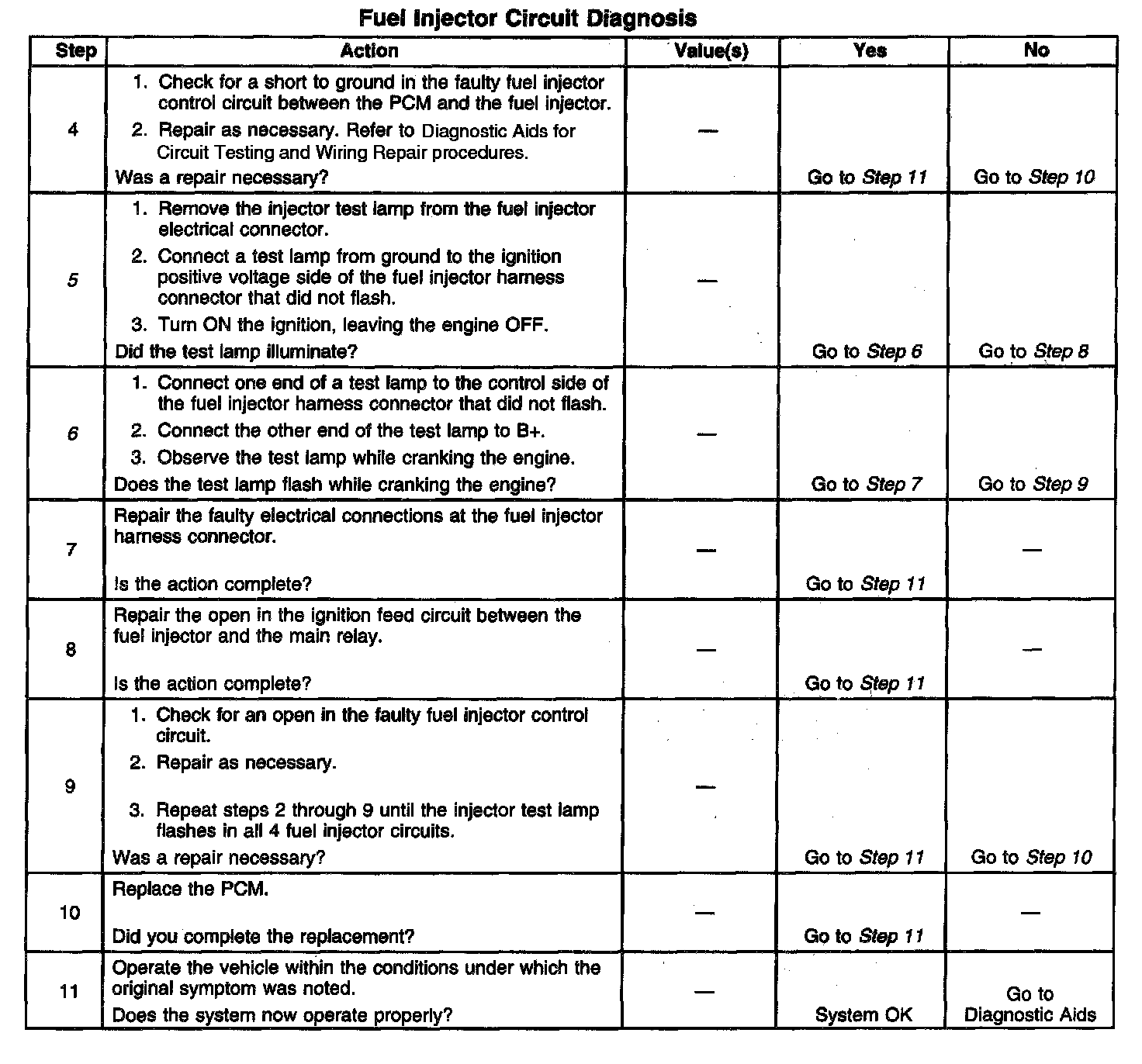 6. This step checks for an open in fuel injector control circuit or for a faulty PCM.