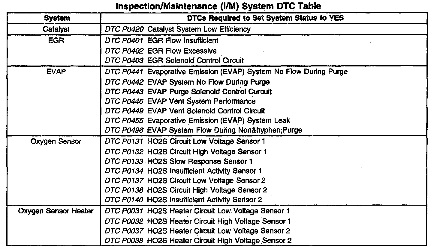 Inspection/Maintenance (I/M) System DTC Table: