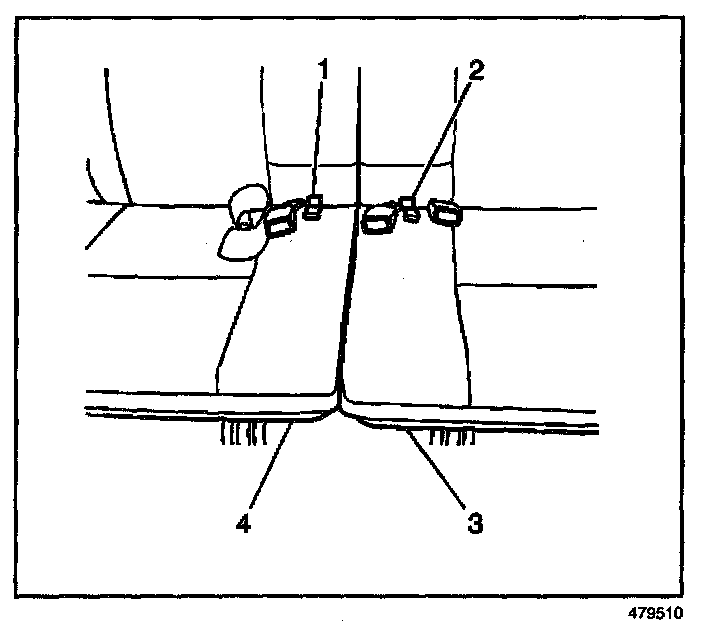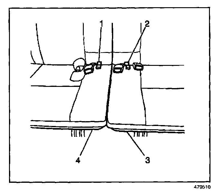 1. Pull the rear seat pull straps (1 and 2) and raise the rear seat cushions (3 and 4) in order to gain access to the rear seat center belt and buckle bolts.
