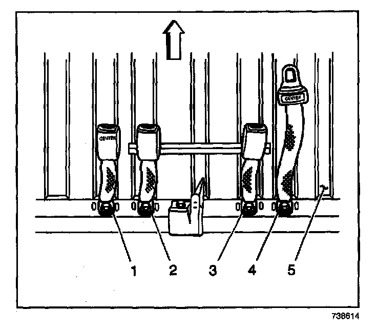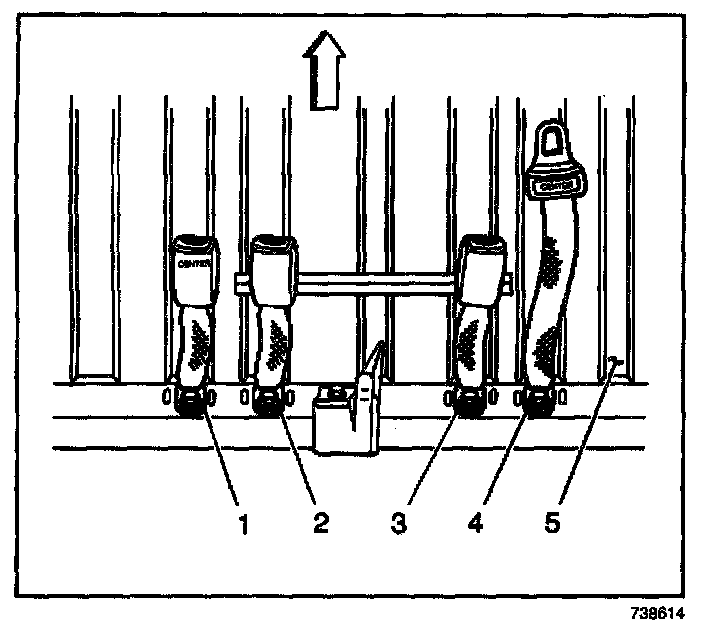 1. Install the rear seat center buckle (1) to the floor pan (5). Secure the buckle with the anchor bolt.