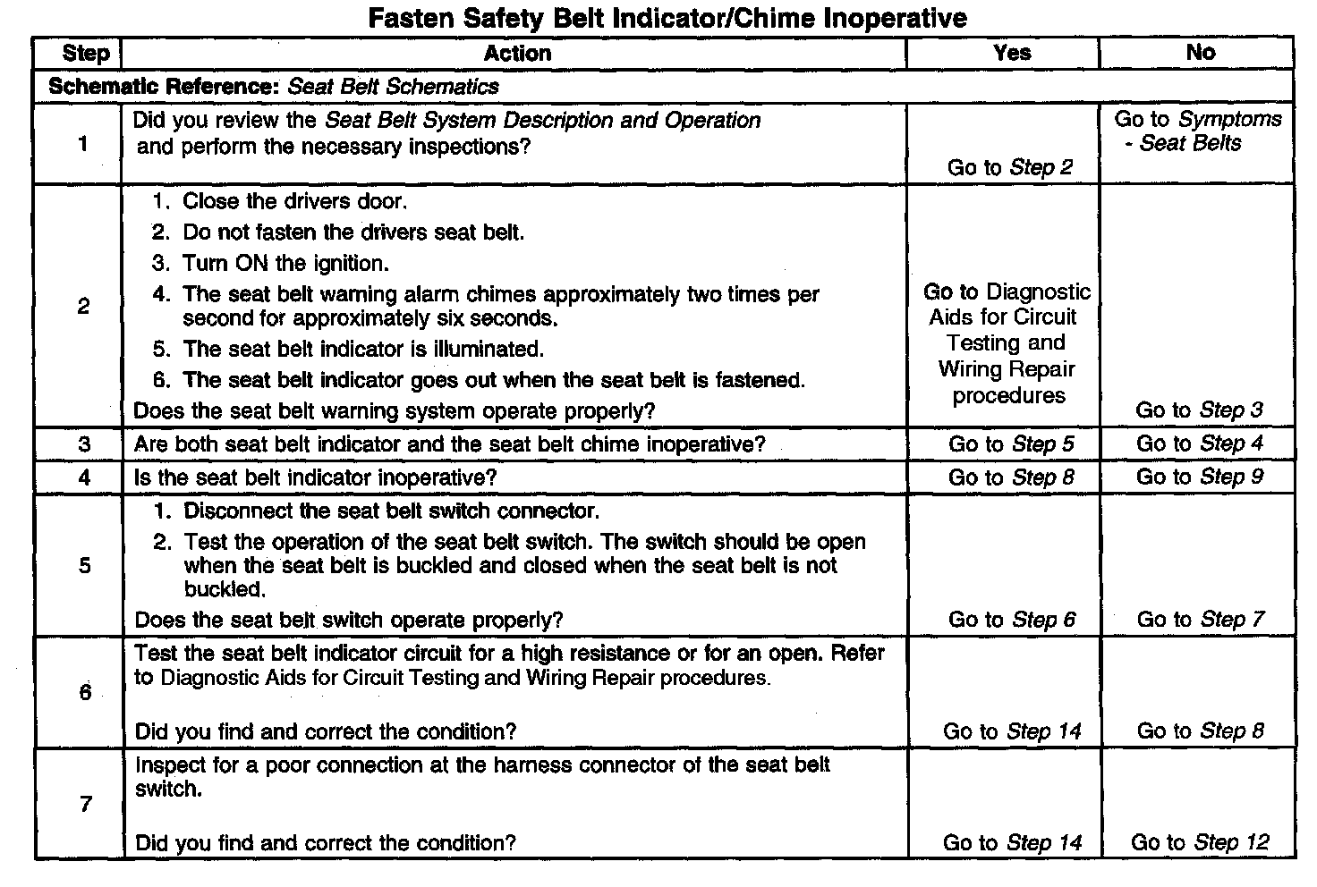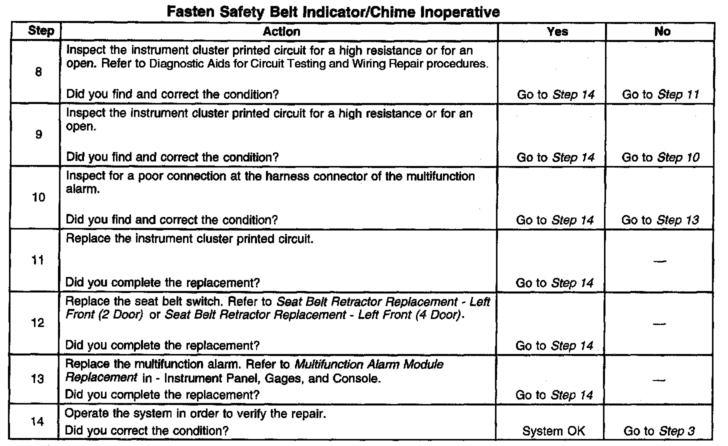 Fasten Safety Belt Indicator/Chime Inoperative