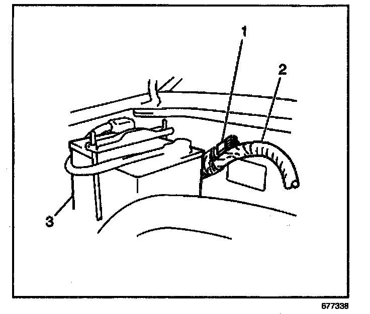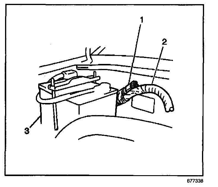 1. Locate the noise suppressor filter (1) taped to the engine harness (2) behind the battery.