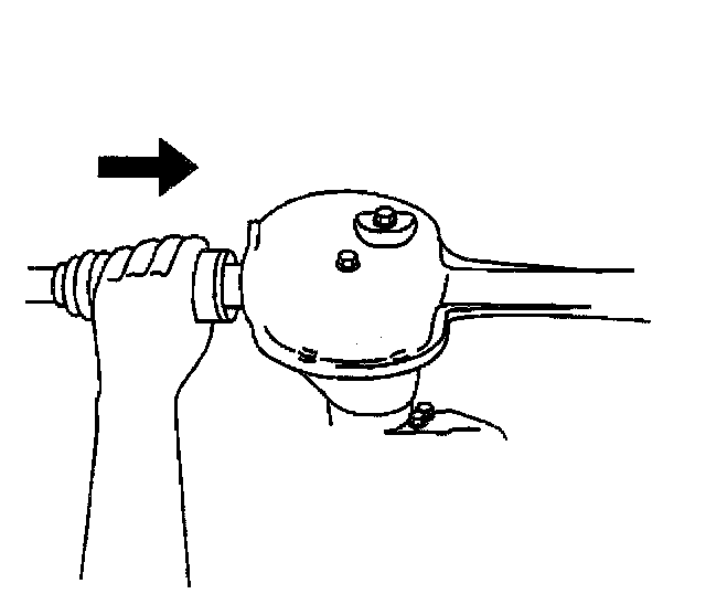 Important: The drive axle circlip may break during the removal and possibly fall into the differential case. If this occurs, the pieces must be removed from the differential. The drive axle is retained with a circlip. If the circlip is off center, the drive axle is very difficult to remove. Center the circlip by rotating and lightly pulling on the drive axle. Continue rotating and pulling until the drive axle pops out about 1 mm (0.039 inch). This movement indicates that the circlip is now centered on the drive axle.