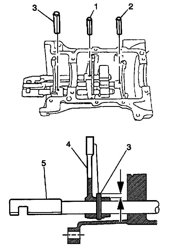 Important: The reverse gearshift fork roll pin (3) is 5 mm (0.187 inch) longer than the low speed gearshift fork roll pin (2) and the high speed gearshift fork roll pin (1).