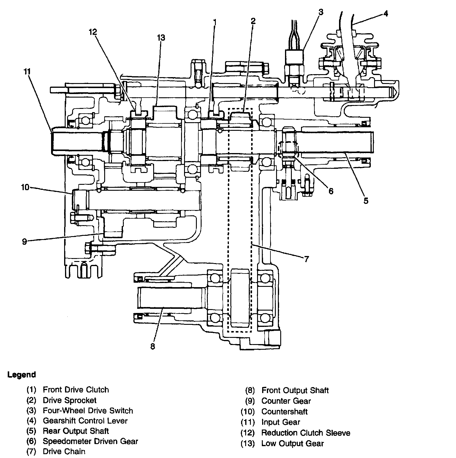 The transfer case contains an input gear, countershaft and counter gear, rear output shaft, low output gear and a front output shaft, for front drive, connected and driven by a drive chain.