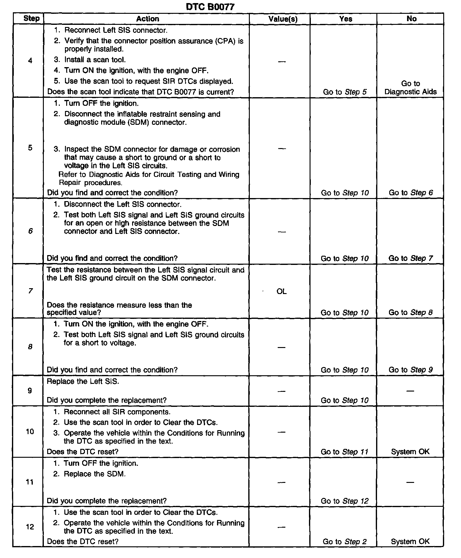 CIRCUIT DESCRIPTIONThe inflatable restraint side impact sensor (SIS)-Left loop is a 2 wire circuit. When the ignition is turned ON, the inflatable restraint sensing and diagnostic module (SDM) performs tests to diagnose critical malfunctions within itself. The SDM provides input power to the SIS. When input power is first detected, the SIS responds by performing internal diagnostics. Next the SIS sends an ID message to the SDM. The SDM will consider this to be a valid ID if the response time is less than 5 seconds after the SIS is powered up. The SIS will continually communicate a status message to the SDM. The SDM can reset the SIS by removing and applying power to it.