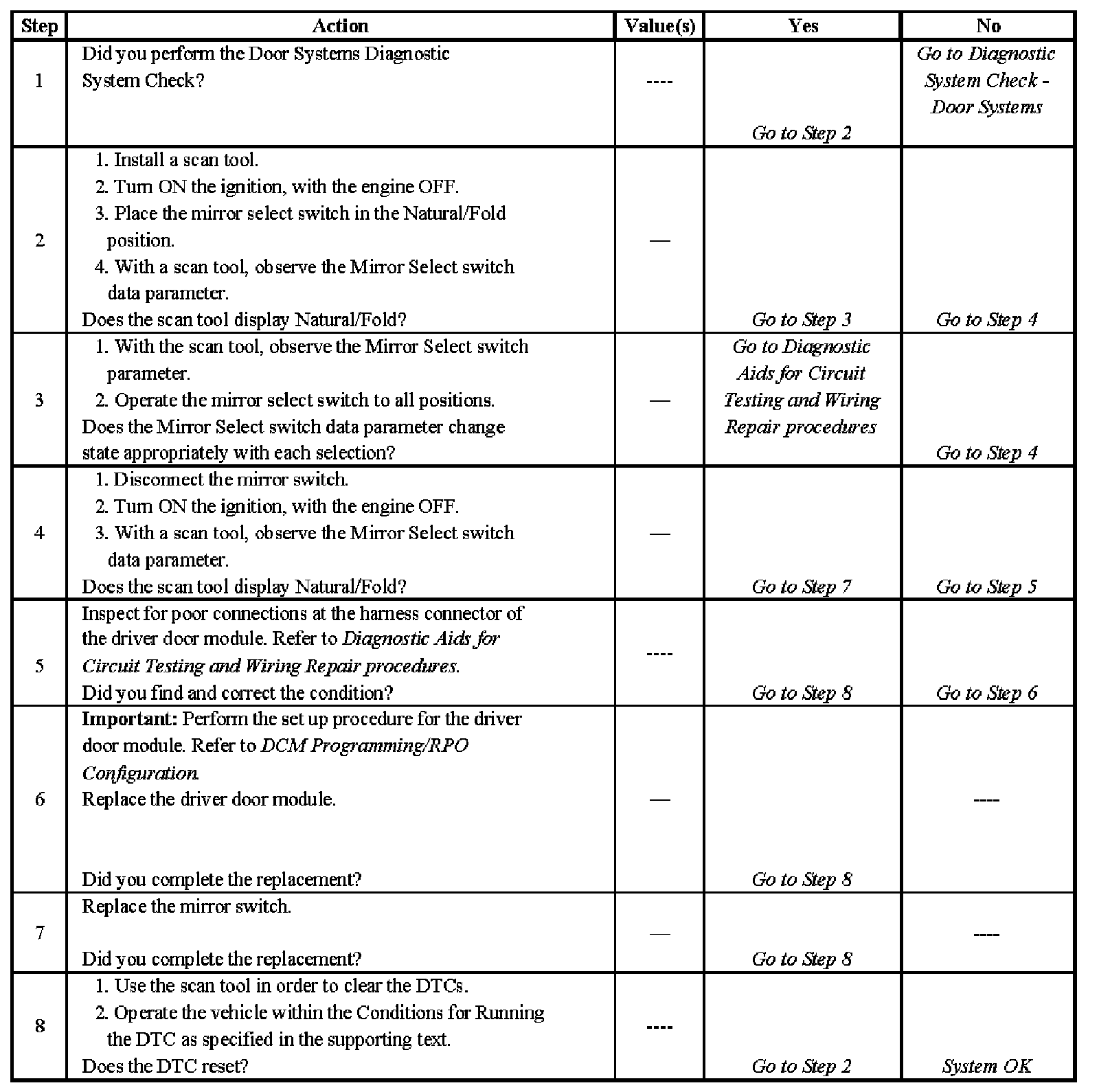 The driver door module senses an active state on both mirror select switch circuits greater than 3 seconds.