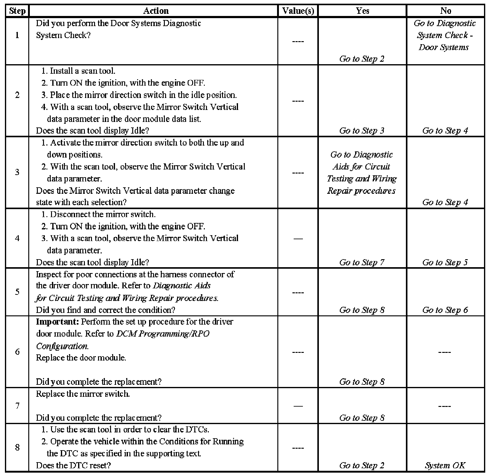 CIRCUIT DESCRIPTIONThe driver door module supplies battery positive voltage to the power mirror switch. When the mirror direction switch is placed in the up or down position, the appropriate signal circuit is switched to battery voltage. The driver door module senses the voltage change and activates the selected outside rearview mirror in the appropriate direction.