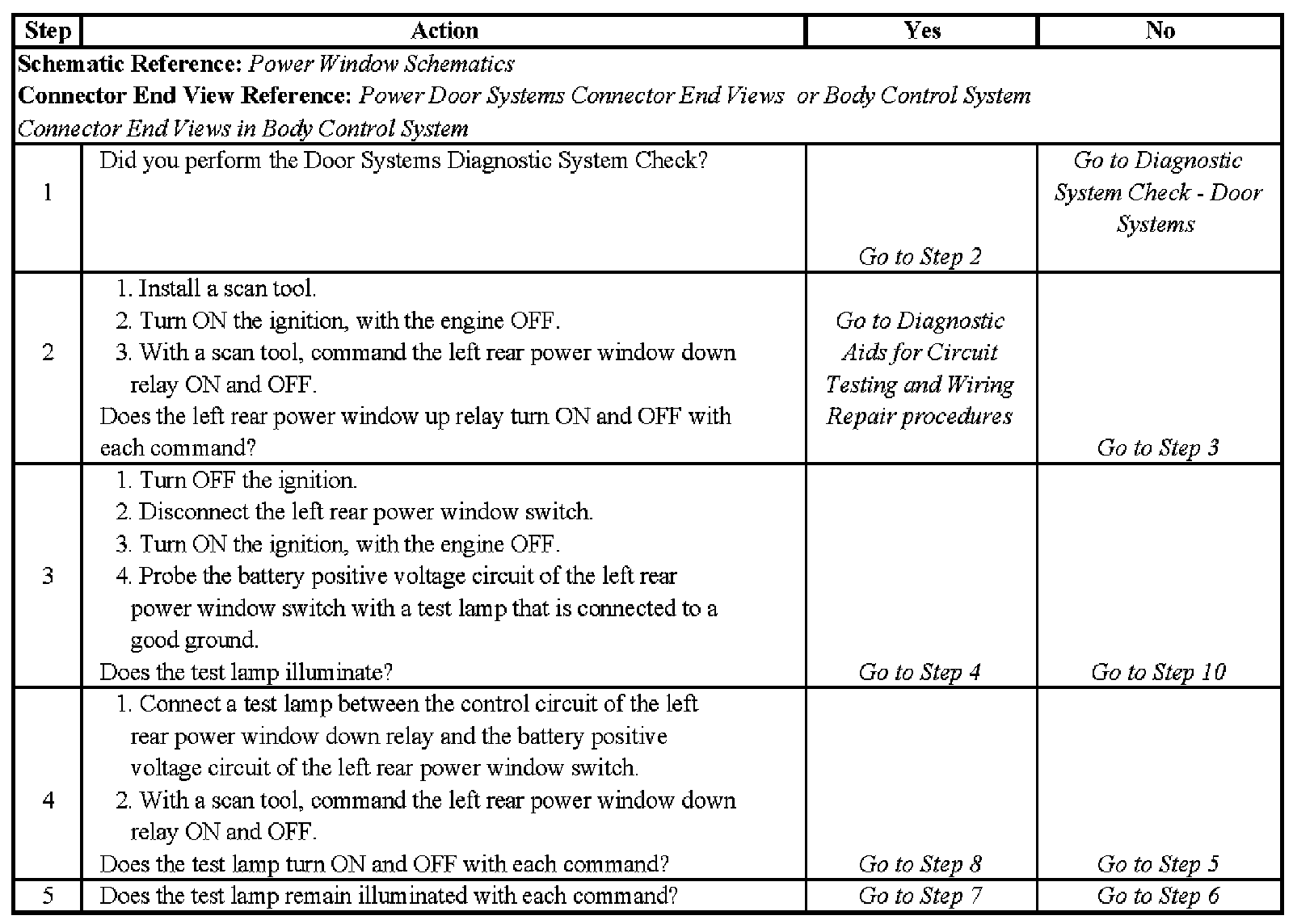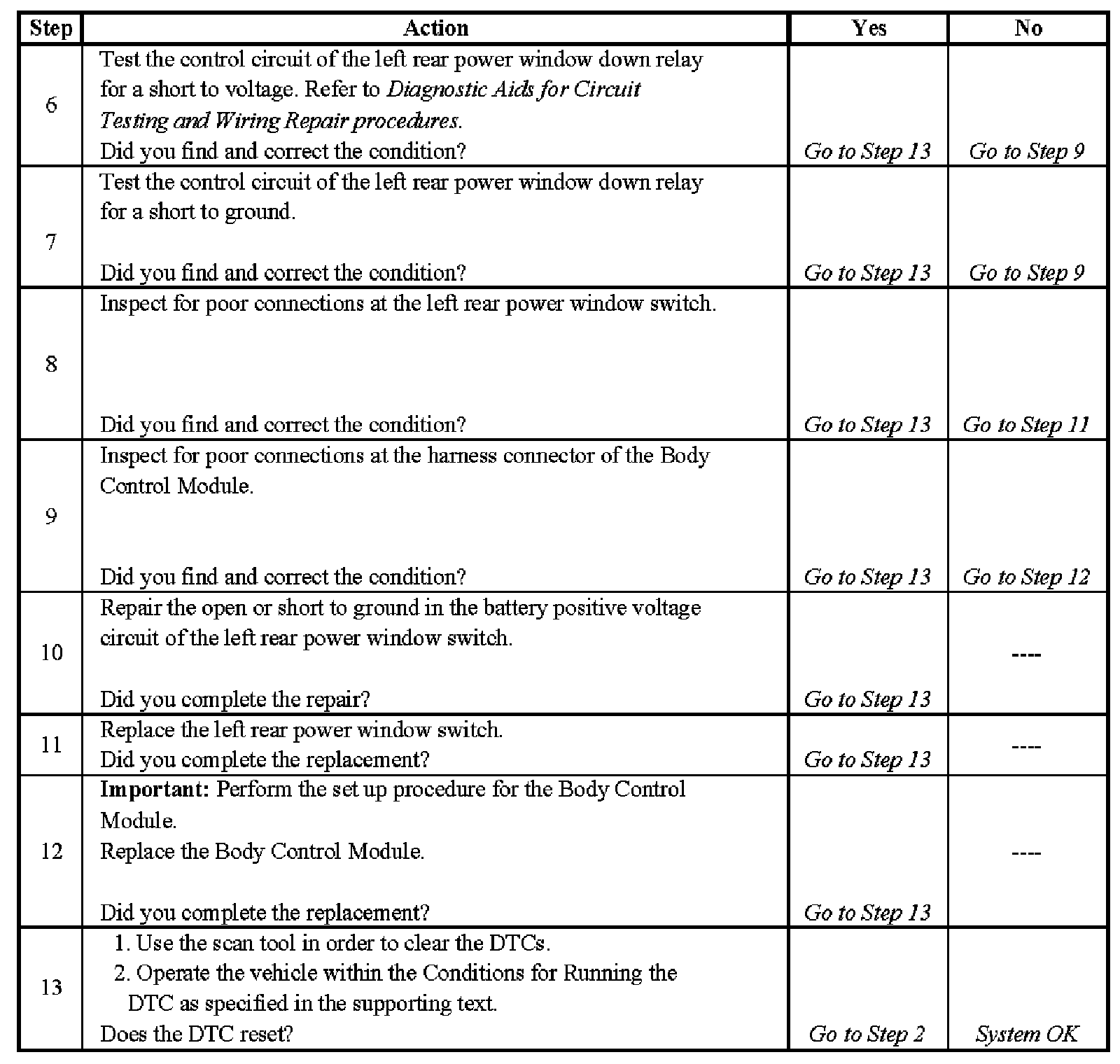^ When the BCM has grounded the left rear power window down relay control circuit and the control circuit is shorted to battery positive voltage.