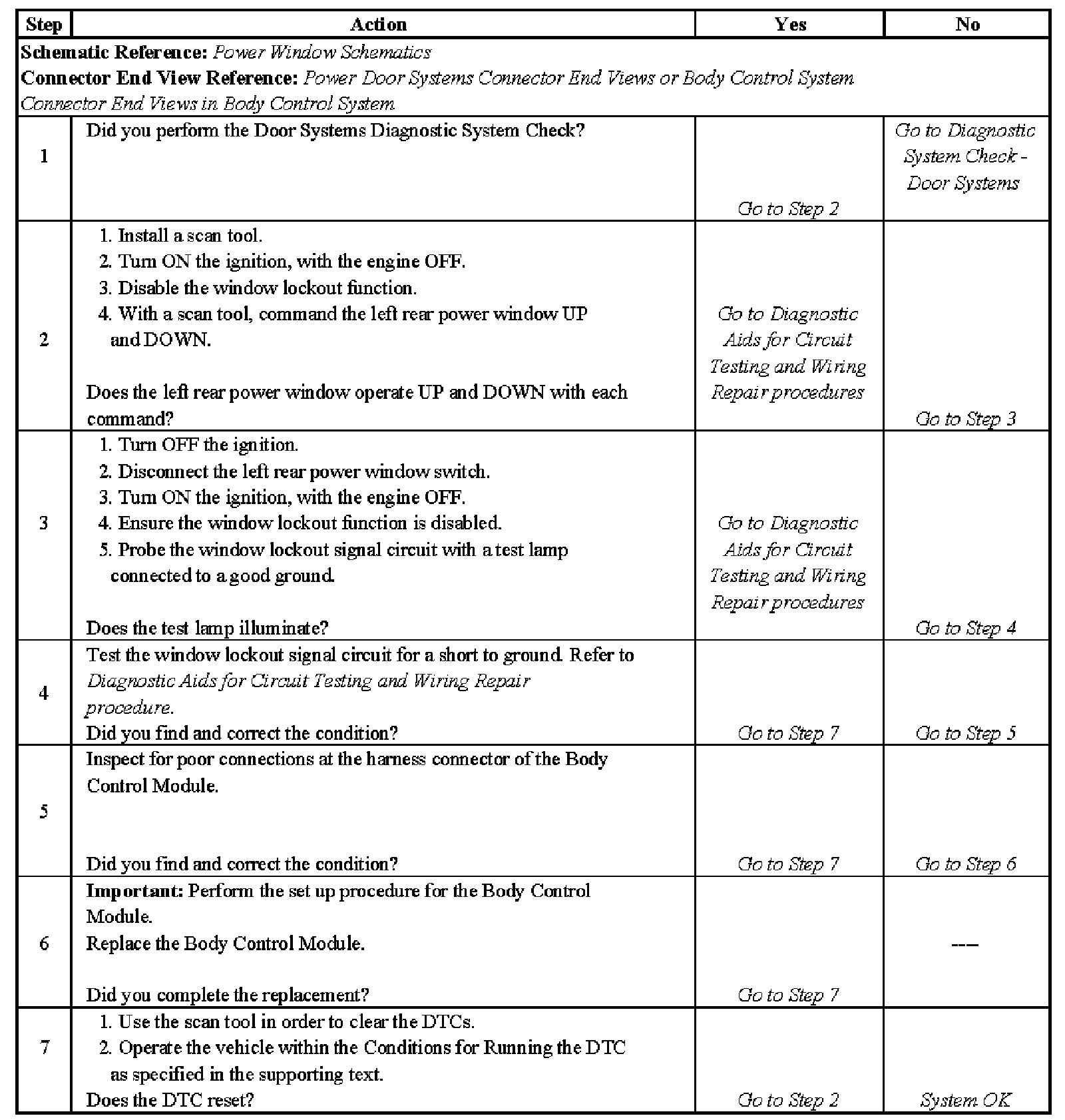 CIRCUIT DESCRIPTIONBattery positive voltage is supplied to the left rear power window switch and the up and down relays through the window lockout signal circuit. If the window lockout function is disabled, the BCM supplies battery positive voltage to the switch and relays and the left rear window operates normally. If the window lockout function is enabled, the BCM will not supply battery positive voltage to the switch and relays and the left rear window will be inoperative unless it is operated from the driver power window switch.