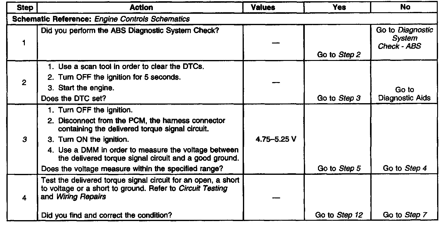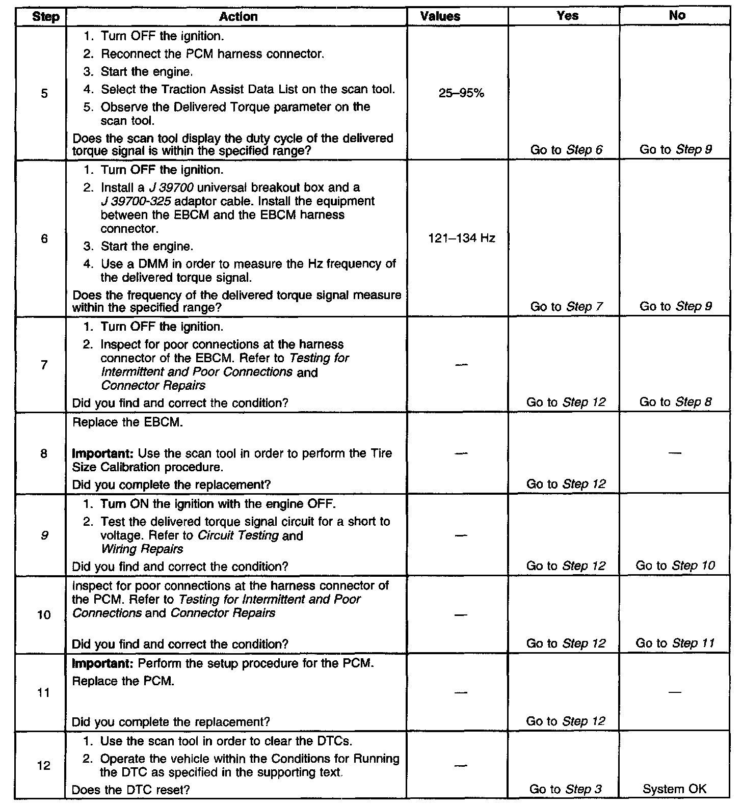 The EBCM supplies 5 VDC to the Powertrain Control Module (PCM) on the delivered torque signal circuit. The PCM toggles this voltage to ground in order to create the delivered torque signal at the EBCM. A signal with a frequency of 128 Hz +/- 5 percent and a duty cycle of 2-95 percent is a valid delivered torque signal. The percentage of duty cycle is proportionate to the percentage of delivered torque.