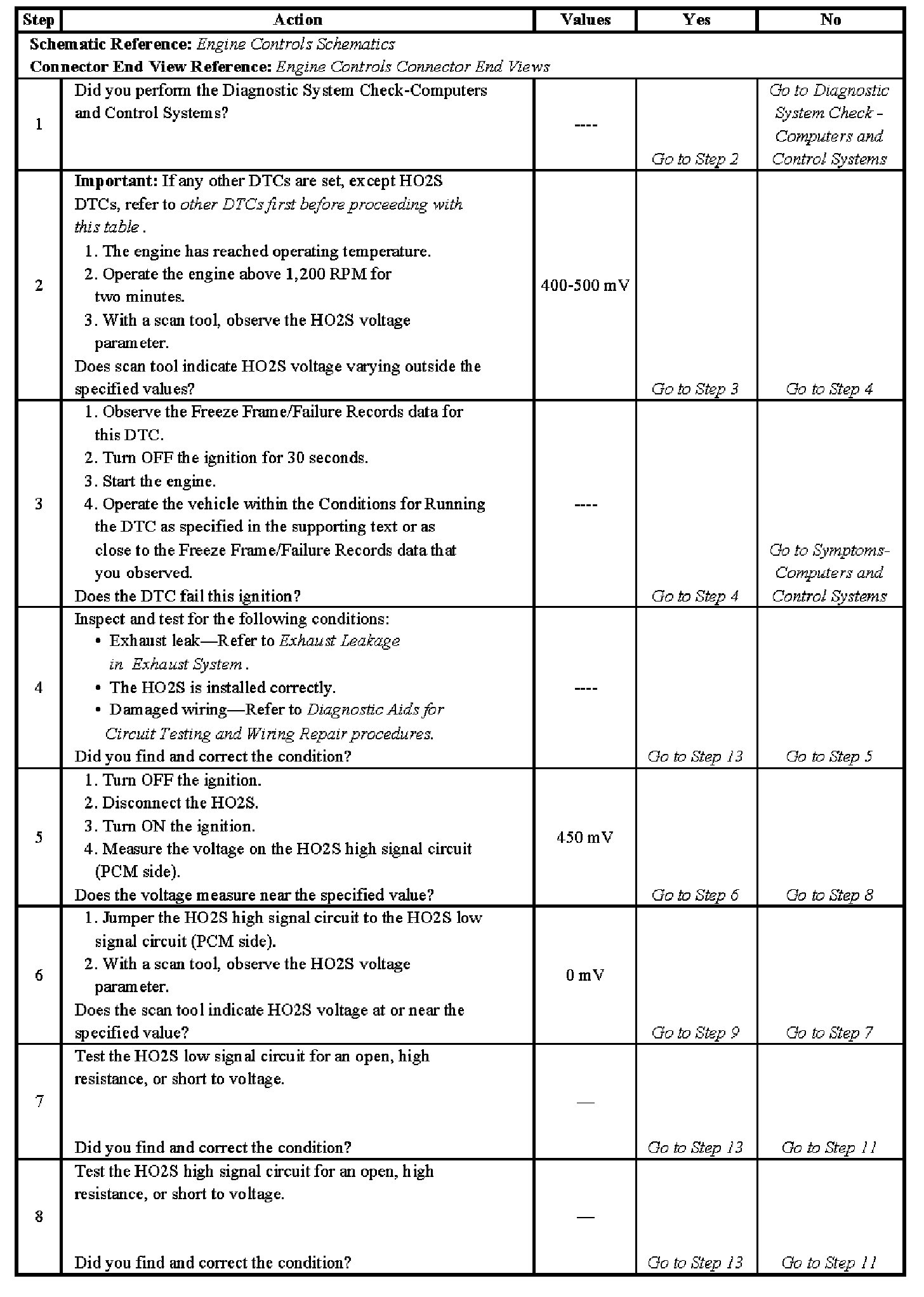 CIRCUIT DESCRIPTIONThe powertrain control module (PCM) supplies a voltage of about 447 mV between the heated oxygen sensor (HO2S 1) high signal and the low signal circuit. The HO2S 1 varies the voltage within a range of about 1000 mV if the exhaust is rich, down through about 100 mV if the exhaust is lean.