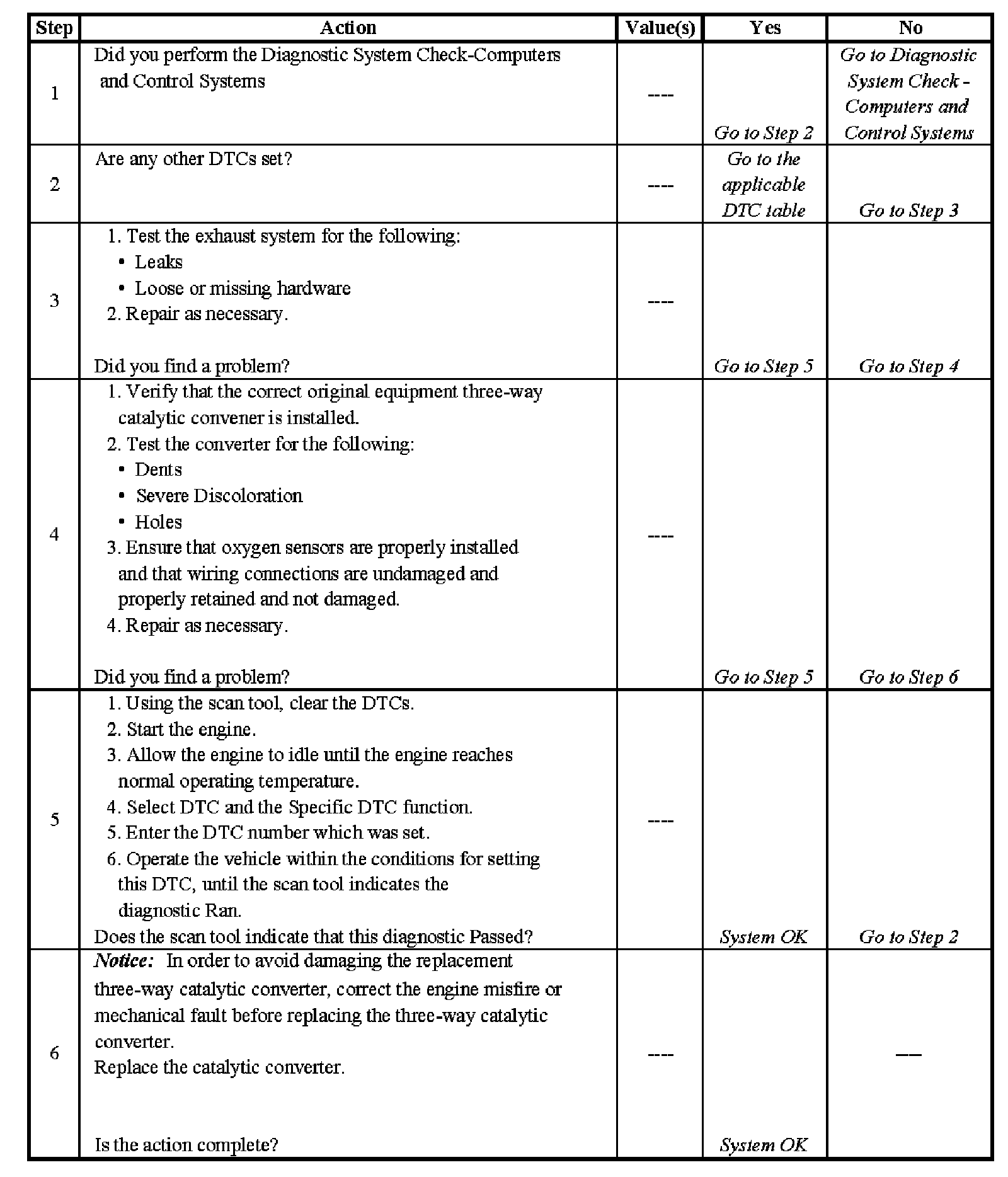 3. This table checks for conditions that can cause the three-way catalytic converter efficiency to appear degraded. Inspect and repair exhaust system as necessary.