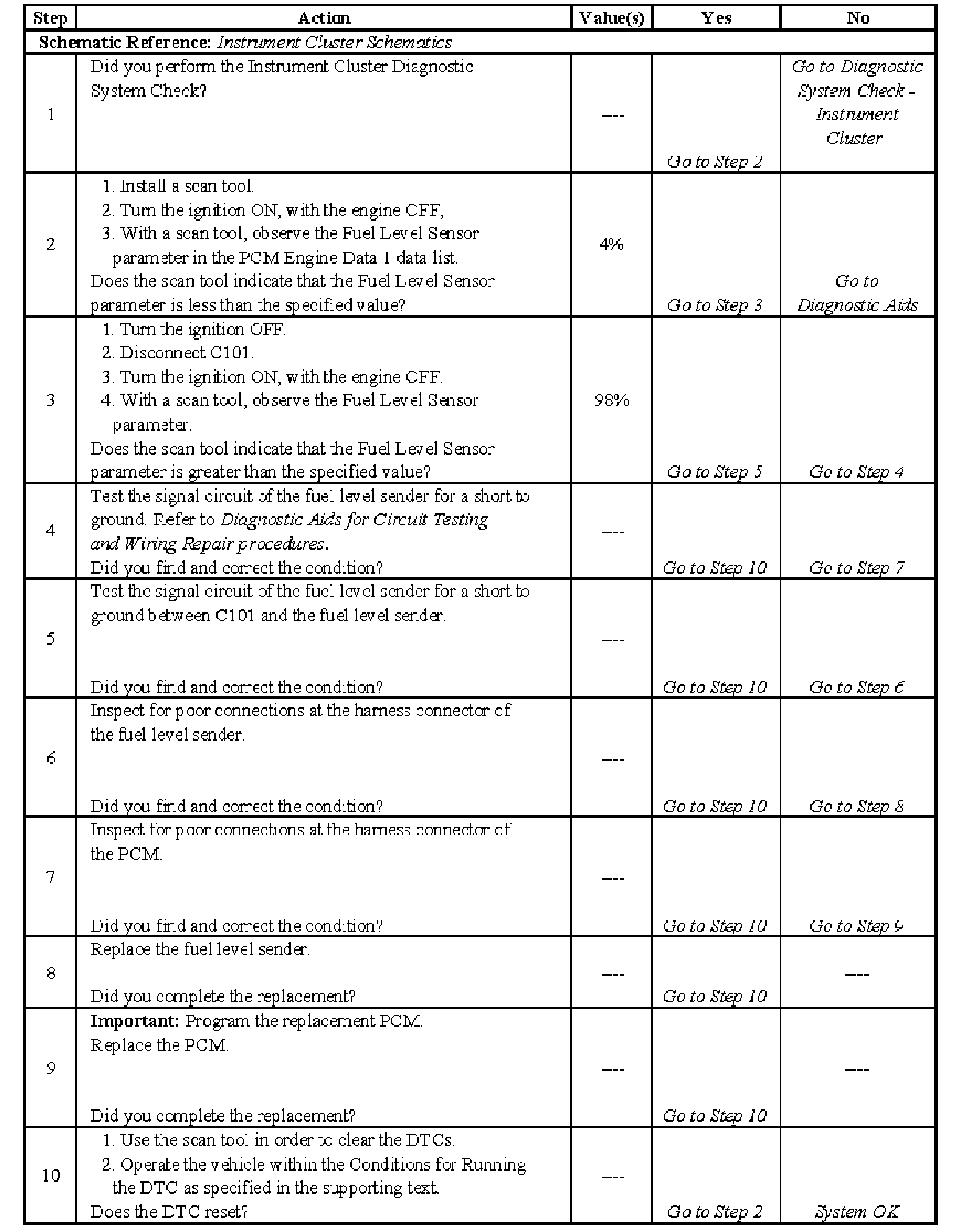 CIRCUIT DESCRIPTIONThe fuel level sender changes resistance based on fuel level. The PCM monitors the signal circuit of the fuel level sender in order to determine fuel level. When the fuel tank is full, the sender resistance is high and the PCM senses a high signal voltage. When the fuel tank is empty, the sender resistance is low and the PCM senses a low signal voltage. The PCM uses the signal circuit of the fuel level sender in order to calculate the total remaining fuel (%) in the tank. The PCM sends the fuel level percent via the class 2 serial data circuit to the instrument cluster in order to control the fuel gauge. The fuel level information is also used for misfire and EVAP diagnostics.